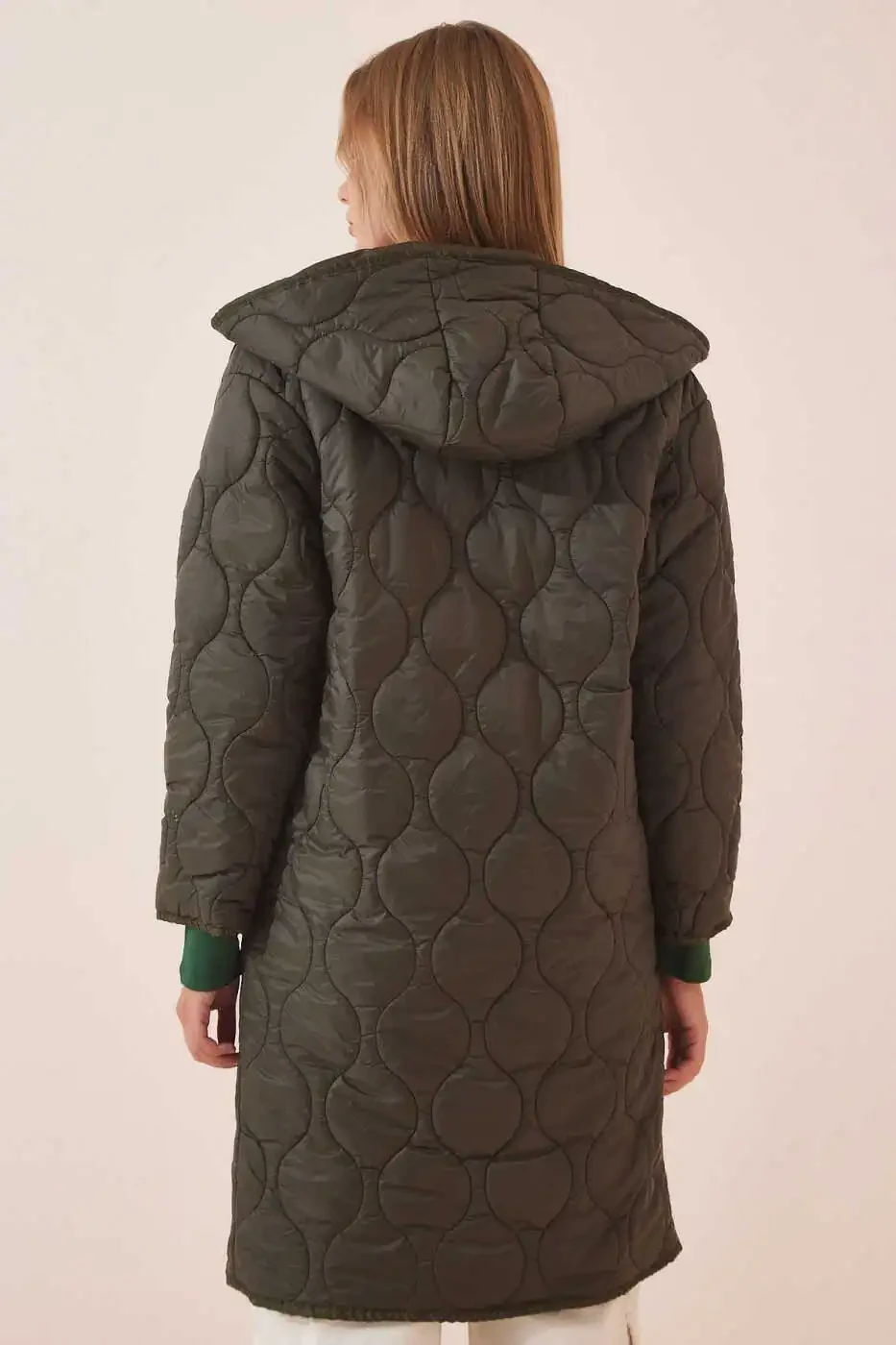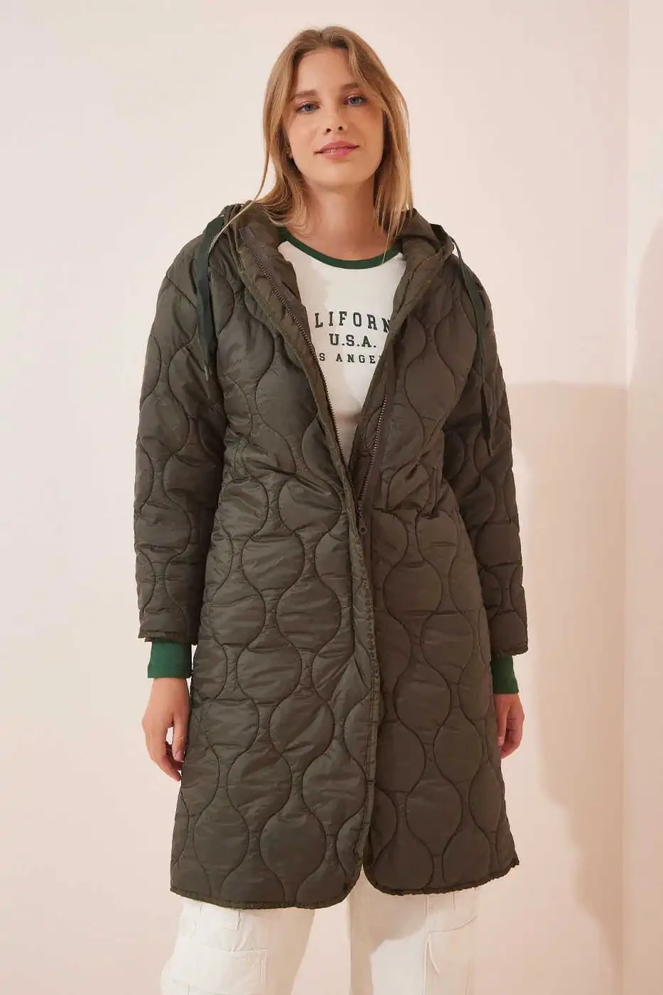 Do you want to stay warm and comfortable without sacrificing your style in cold weather? Then the Women's Khaki Hooded Quilted Coat Modazone00052 is for you! Offered with the assurance of Trendyol, this coat will be an indispensable part of your wardrobe with its modern design and functional features. Thanks to the quilted filling technique, the coat provides superior heat insulation, effectively protecting you from the cold while being light and comfortable. Its puffy silhouette, diamond pattern, and khaki color offer a trendy look. Ideal for everyday use, this coat pairs perfectly with jeans, tights, or dresses. It is a perfect choice for modern women who want to create a stylish and comfortable style. The hooded design protects your head and neck from the cold, while practical pocket details allow you to carry your belongings safely. Its midi length offers both a stylish look and does not restrict your freedom of movement. The lined structure provides extra comfort and warmth, while the polyester material composition guarantees durability and longevity. Adapting to every body type thanks to its regular fit, this coat offers both comfort and elegance. Complete your style with this coat that will be your savior in the mid-seasons and cold winter days!