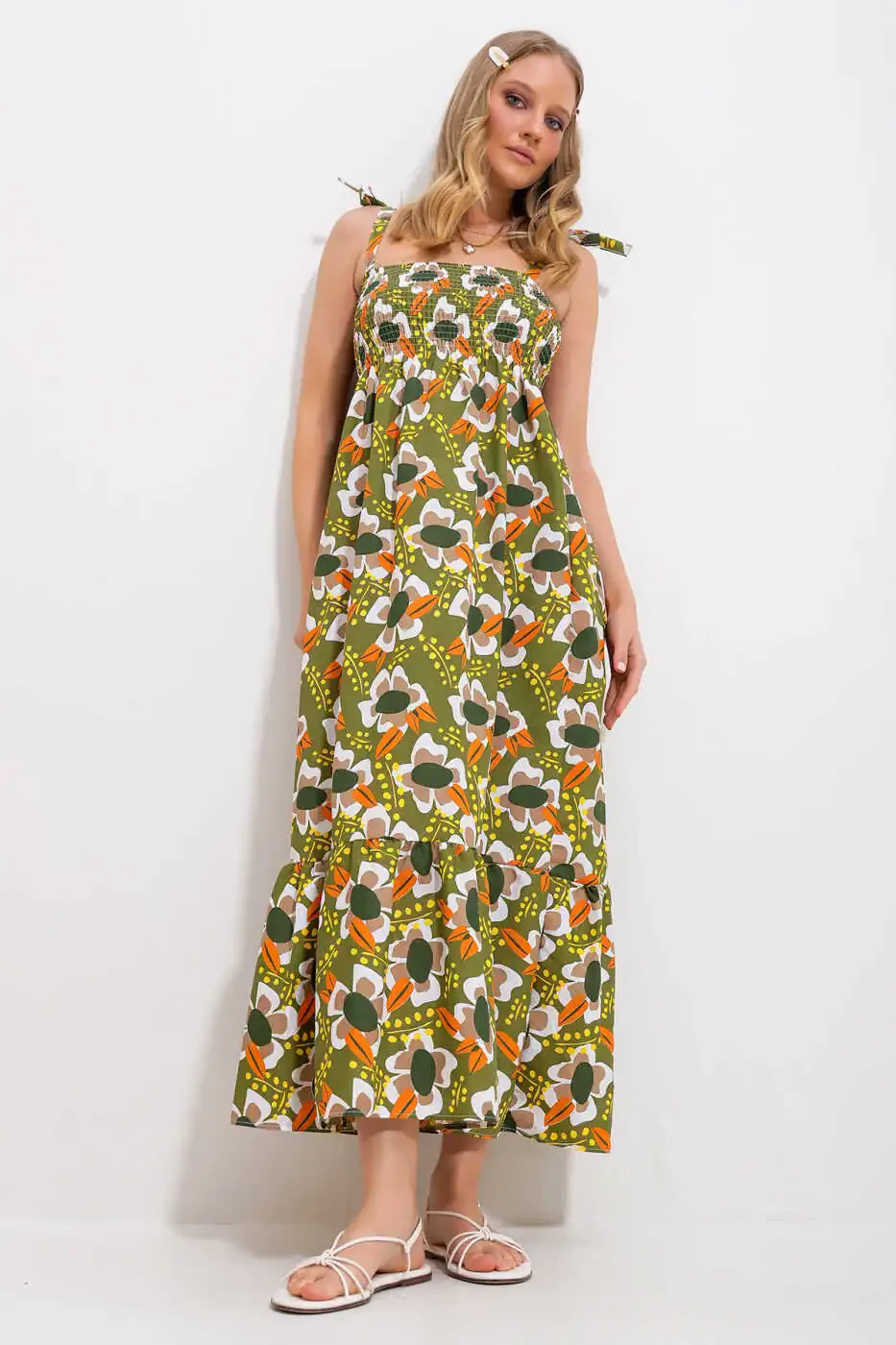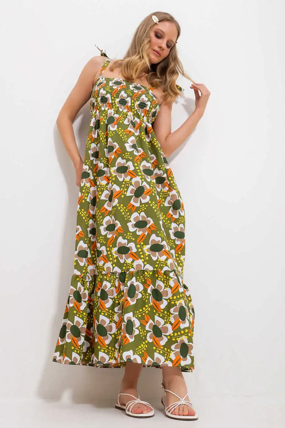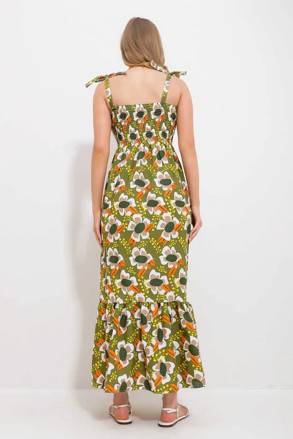 This dress, combining elegance and comfort, is ready to become an indispensable part of your wardrobe. Khaki color offers a neutral tone that suits every style, while the ruffled skirt and floral embroidered texture add a feminine touch. The strapless design will keep you cool in the summer heat, while the comfortable fit will allow you to move freely all day long.