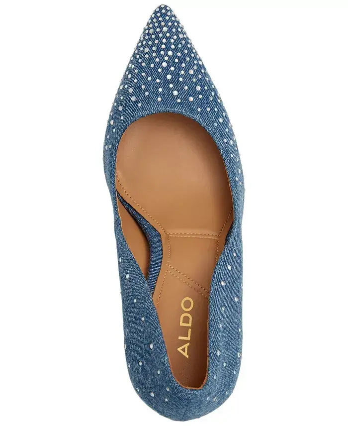 Dress up your entire wardrobe in the Lala pointed-toe stiletto pumps from ALDO. Stiletto heel: 4" Pointed toe Slip on Aldo Pillow Walk- Cushioned insole designed with dual-density padding Upper: cotton; lining: polyurethane, polyester; trim: glass Spot clean Imported