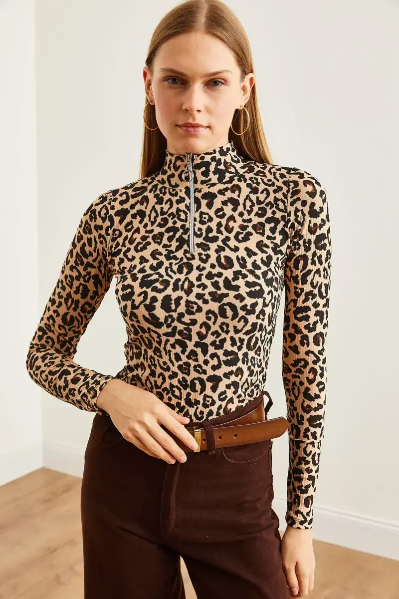 Women's Leopard Beige Zippered Turtleneck Lycra Blouse BLZ-19001155-Leopard Beige is a special design that combines elegance and comfort. This blouse is a must-have in the modern woman's wardrobe. The leopard pattern, combined with the warmth of the beige color, offers a sophisticated and eye-catching look. The zippered turtleneck detail adds a different touch to the blouse, while also providing ease of use. This blouse, which you can easily prefer for daily use as well as special events, will add elegance to any combination.Thanks to its 95% polyester and 5% lycra blend fabric, the blouse fits the body perfectly and offers comfortable use all day long. The lycra content creates a feeling of nothing on you, without restricting your freedom of movement. The durability of the polyester fabric ensures long-lasting use, while its non-wrinkling structure ensures that you always look well-groomed.This blouse is designed to suit every body type with its different size options. The S/36 size on the model can give you an idea of how the blouse will look on you. By considering the model's measurements (Height: 1.76, Bust: 84, Waist: 60, Hips: 90), you can choose the one that suits your body best. The blouse's length/chest measurements are 59/35 cm.The leopard pattern is a pattern that is always on trend and eye-catching. This blouse creates both a modern and classic look by using the leopard pattern in an elegant way. The beige color, on the other hand, makes the leopard pattern softer and warmer, ensuring harmony with all kinds of combinations. Whether you create a casual chic look with jeans or a more special look with skirts, this blouse will always complete your style.The zippered turtleneck detail adds a modern touch to the blouse, while also offering different usage options. You can get a warmer turtleneck look by completely closing the zipper, or you can create a more comfortable and stylish look by slightly opening the zipper. This detail makes the blouse versatile to suit different weather conditions and different styles.The blouse is also very easy to care for. Being machine washable provides practicality in daily use. However, it is recommended that you wash it at low temperatures and avoid drying it in the dryer to maintain the vibrancy of the colors. Thanks to its non-ironing fabric, it ensures that you always look well-groomed and stylish.This product is offered to you with Trendyol assurance. Thanks to Trendyol's fast and reliable delivery service, you can have your blouse in the shortest time. In addition, thanks to the free return option within 15 days, you can easily return the product if you do not like it.Women's Leopard Beige Zippered Turtleneck Lycra Blouse BLZ-19001155-Leopard Beige is a special product that combines elegance, comfort and quality. This blouse, which will be an indispensable part of your wardrobe, will always help you reflect your style.