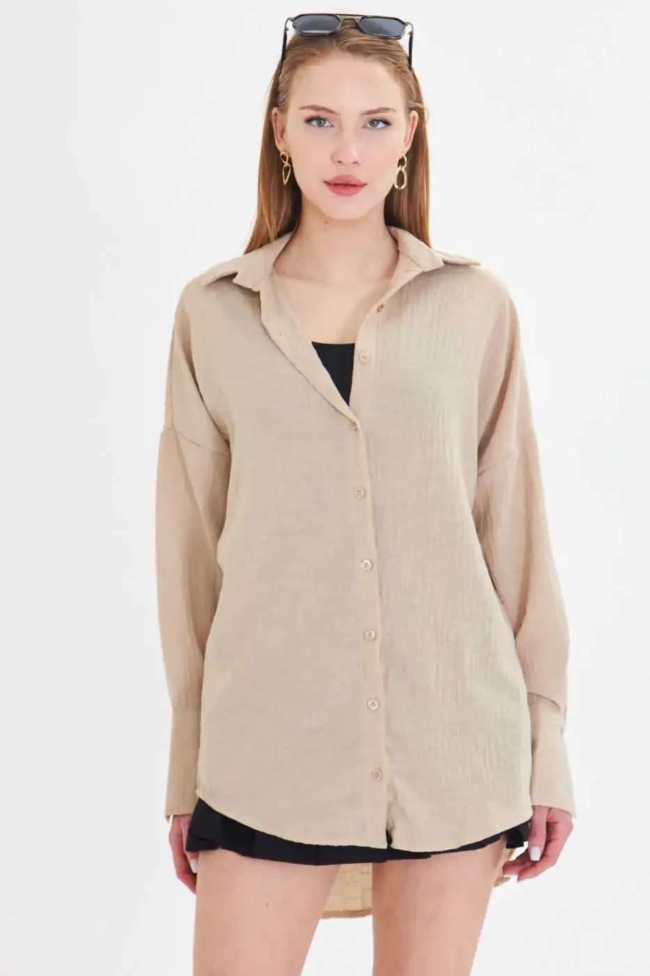 This light beige oversized shirt, perfect for women seeking comfort and style in everyday life, stands out with its texture and wide sleeves. Its linen-look fabric offers both stylish and comfortable wear. This shirt, with its oversized cut that hugs your body, will easily adapt to all your outfits.