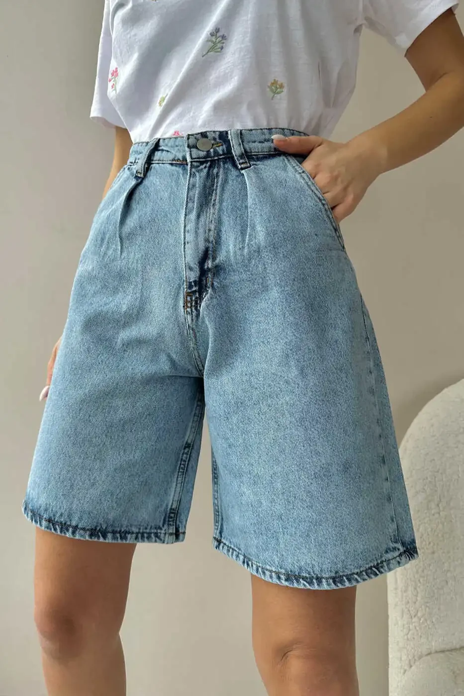 Our light blue high waist wide leg bermuda denim shorts, a trend piece of this season, combine comfort and style. Its slightly loose fit and high waisted design fits perfectly on every body type. Made of cotton denim fabric, these shorts offer all-day comfort. The high waisted design emphasizes your waist, making your figure appear slimmer, while the wide leg cut makes your legs look longer and more elegant. The light blue color can be easily combined with any top. You can combine these shorts with a white t-shirt and sneakers for a casual look. For a more stylish look, you can combine it with a crop top and high heels.