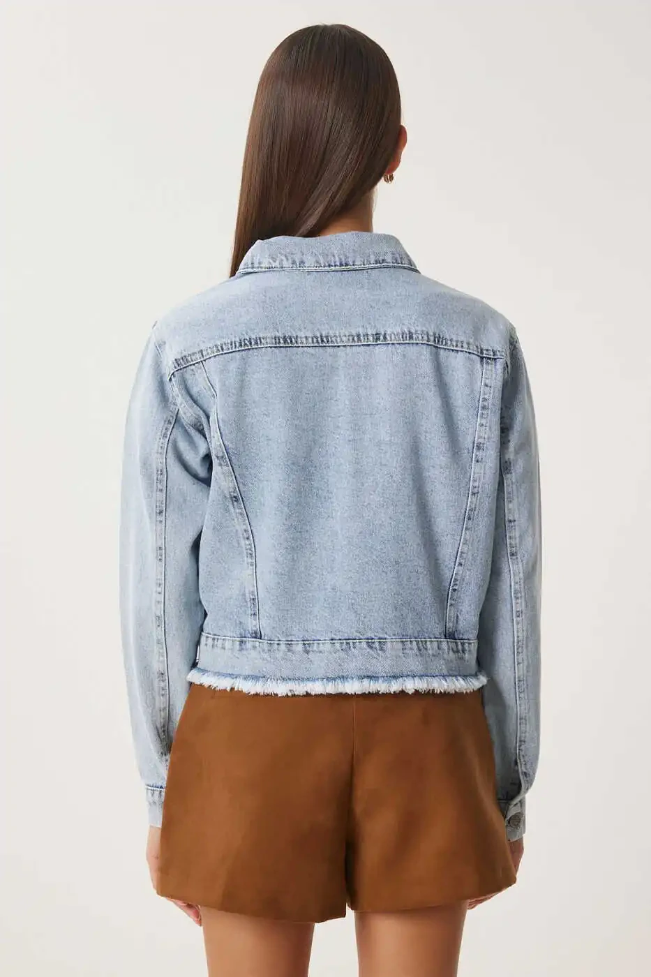 Designed for women seeking a stylish and modern look, the Women's Light Blue Tasseled Denim Jacket AN00218 will be an indispensable part of your wardrobe. This jacket, which stands out with its light blue color and tassel details, can be easily used both in daily life and on special occasions. Thanks to its 100% cotton fabric, the jacket has a soft texture and provides comfort throughout the day. Its metal buttons and front pockets add both a stylish and functional touch to the jacket. The light wash denim fabric gives the jacket a vintage look, while its modern cut adapts to every style. The jacket, which is suitable for standard sizes with a length of 50 cm and a sleeve length of 58 cm, is displayed on a model with a height of 1.72 cm, chest 83 cm, waist 58 cm, and hips 87 cm. There may be color variations due to lighting differences in studio shots. This product will be delivered to you with the assurance of Trendyol and you will be able to benefit from the campaign price. Moreover, there are more than 100 pieces in stock!