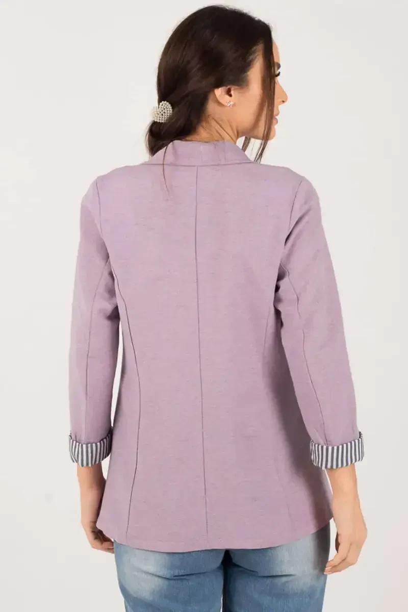 Women's Lilac Single Button Jacket with Striped Inner Sleeve ARM-22K001122-Lilac is a versatile clothing alternative that can adapt to any environment with its modern and stylish design. The jacket's vibrant lilac color adds an energetic and positive vibe, while the thin stripe details inside the sleeve add a different dimension to the jacket. These details make the jacket stand out from the ordinary, giving it a more sophisticated and unique look. The single button closure detail creates an elegant accent on the front of the jacket, while allowing the jacket to be easily put on and taken off. The jacket's cut has a structure that fits the body but does not restrict freedom of movement. In this way, it offers comfortable use throughout the day. This jacket, which has a wide range of uses from business meetings to evening dinners, weekend trips to special invitations, can be easily combined with different combinations. For example, you can create a professional look by combining it with a stylish blouse and pencil skirt, or you can create a more casual style by combining it with a basic t-shirt and jeans. This jacket, which offers long-lasting use thanks to its high-quality fabric, is also a practical option with its non-wrinkling structure. This jacket, which will be an indispensable part of your wardrobe, will always make you look stylish and well-groomed. While adding vitality to your combinations with the energy of lilac color, you can also differentiate your style with the stripe details inside the sleeve. Women's Lilac Single Button Jacket with Striped Inner Sleeve ARM-22K001122-Lilac is a candidate to be the choice of stylish women. This jacket, which can be worn in all seasons, is a must-have in your closet. You will always be remarkable and unique with this special design jacket that combines elegance and comfort. This jacket, which will help you reflect your style both in daily life and in special moments, will be one of the most loved pieces of your wardrobe.