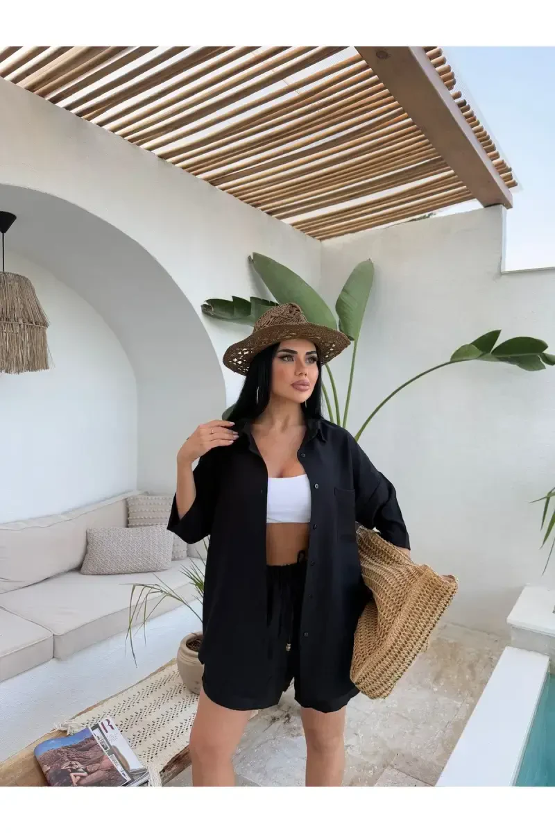 Designed for women who want to be both stylish and comfortable on hot summer days, this linen oversize shirt shorts set will become an indispensable part of your wardrobe. Made from lightweight and breathable linen fabric, the set offers all-day comfort while bringing style along.
