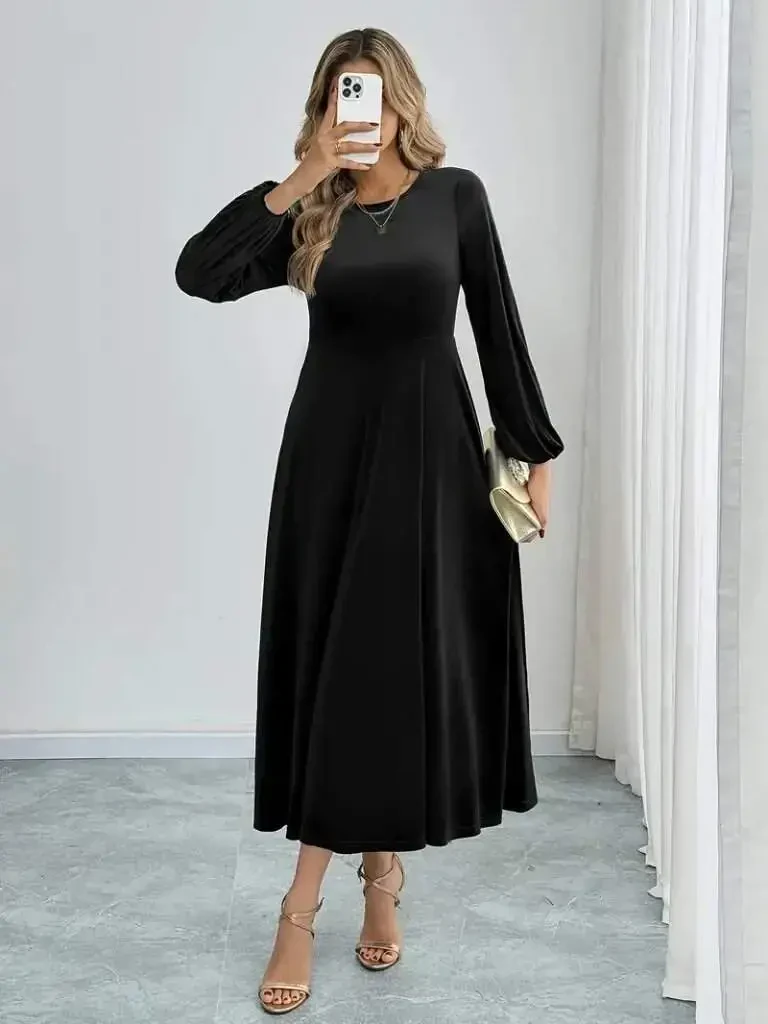 Women's dress, velvet dress, midi dress, long sleeve dress, crew neck dress, elegant dress, comfortable dress, casual dress, special occasion dress, women's clothing