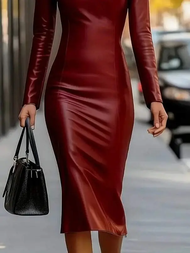 Women's leather dress, long sleeve midi dress, V-neck dress, faux leather dress, elegant dress, modern women's dress, autumn winter dress, party dress, casual dress, comfortable dress