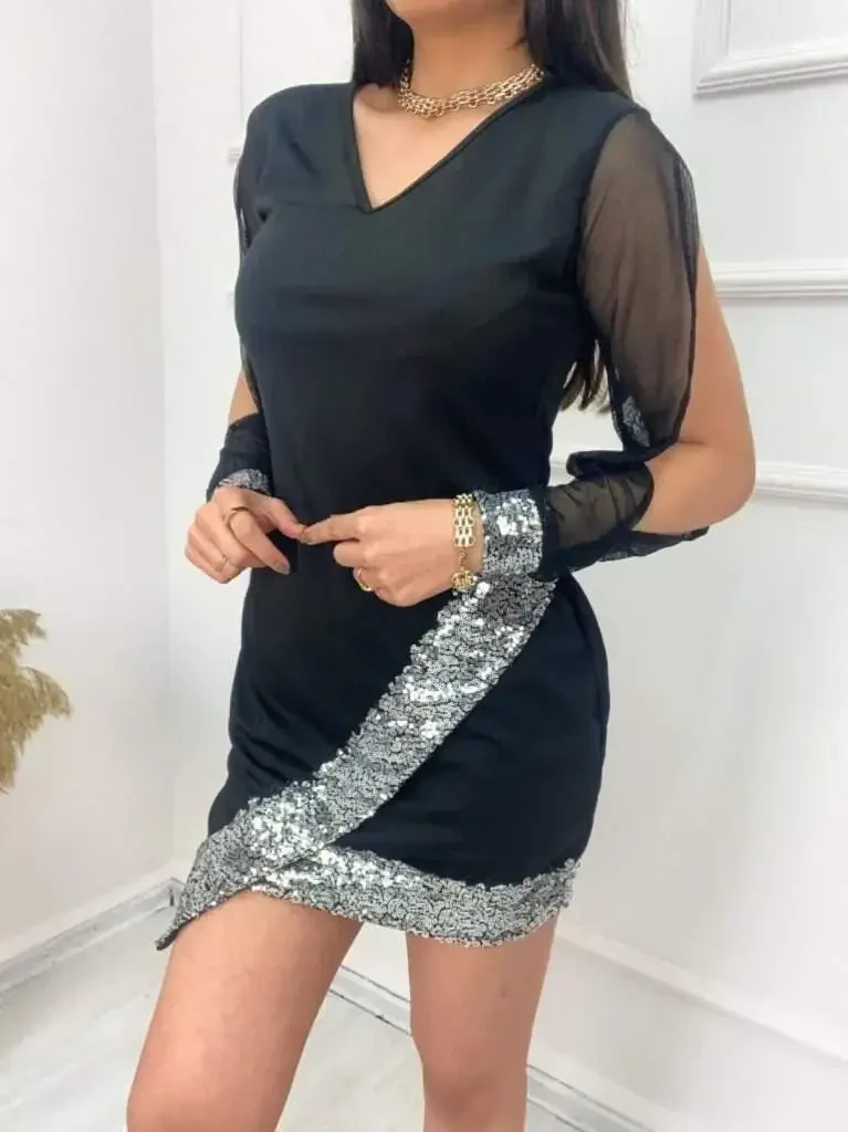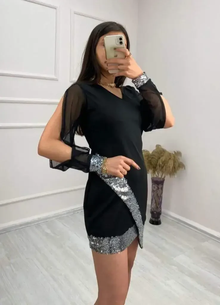 Get ready to stand out in any setting with the Stylish and Eye-Catching Women's Long Sleeve V-Neck Sequin Imported Crepe Mini Dress! This special design dress will be an indispensable part of your wardrobe with its elegant crepe fabric, sparkling sequin details, and modern cut. This mini dress, which you can easily choose for both special occasions and stylish dinner parties, will give you a confident and attractive look. The long sleeves of the dress allow you to be comfortable without sacrificing your elegance even in cool weather. The V-neckline elegantly emphasizes your décolleté, while the mini skirt length makes your legs look longer and fitter. Sequin details perfectly reflect light, adding a dazzling shine to you. The quality of the imported crepe fabric ensures that the dress fits perfectly on you and makes you feel comfortable all day long. This dress not only looks stylish but also prioritizes comfort. The imported crepe fabric provides a soft touch to your skin and does not restrict your freedom of movement. The cut of the dress gently follows your body lines while skillfully concealing imperfections. In this way, it provides a perfect fit for every body and makes you feel great. Women's Long Sleeve V-Neck Sequin Imported Crepe Mini Dress appeals to every taste and need with its different color and size options. Whether classic black, vibrant red, or pastel tones, you can reflect your own style by choosing the color that suits you best. You can complete your dress with stylish high heels and elegant jewelry to create an unforgettable combination. This special design dress is not just a piece of clothing, but also a form of expression. Choose this dress to feel special, increase your self-confidence, and attract attention in any environment. You will always be stylish, elegant, and eye-catching with this dress, which will be the most valuable piece of your wardrobe. Order now and start reflecting your sparkle!Product DescriptionGet ready to stand out in any setting with the Stylish and Eye-Catching Women's Long Sleeve V-Neck Sequin Imported Crepe Mini Dress! This special design dress will be an indispensable part of your wardrobe with its elegant crepe fabric, sparkling sequin details, and modern cut. This mini dress, which you can easily choose for both special occasions and stylish dinner parties, will give you a confident and attractive look. The long sleeves of the dress allow you to be comfortable without sacrificing your elegance even in cool weather. The V-neckline elegantly emphasizes your décolleté, while the mini skirt length makes your legs look longer and fitter. Sequin details perfectly reflect light, adding a dazzling shine to you. The quality of the imported crepe fabric ensures that the dress fits perfectly on you and makes you feel comfortable all day long. This dress not only looks stylish but also prioritizes comfort. The imported crepe fabric provides a soft touch to your skin and does not restrict your freedom of movement. The cut of the dress gently follows your body lines while skillfully concealing imperfections. In this way, it provides a perfect fit for every body and makes you feel great. Women's Long Sleeve V-Neck Sequin Imported Crepe Mini Dress appeals to every taste and need with its different color and size options. Whether classic black, vibrant red, or pastel tones, you can reflect your own style by choosing the color that suits you best. You can complete your dress with stylish high heels and elegant jewelry to create an unforgettable combination. This special design dress is not just a piece of clothing, but also a form of expression. Choose this dress to feel special, increase your self-confidence, and attract attention in any environment. You will always be stylish, elegant, and eye-catching with this dress, which will be the most valuable piece of your wardrobe. Order now and start reflecting your sparkle!Product Features* Long sleeve design* V-neck cut* Sequin details* Imported crepe fabric* Mini skirt length* Different color options* Comfortable and stylish design* Body-hugging cutAdditional InformationThe size on the model is S/36. The fabric content of the product is 95% Polyester, 5% Elastane. Please follow the washing instructions on the label to use your product for a long time. It is a stylish design that you can easily choose for your special days and invitations. The product is available in different color options.