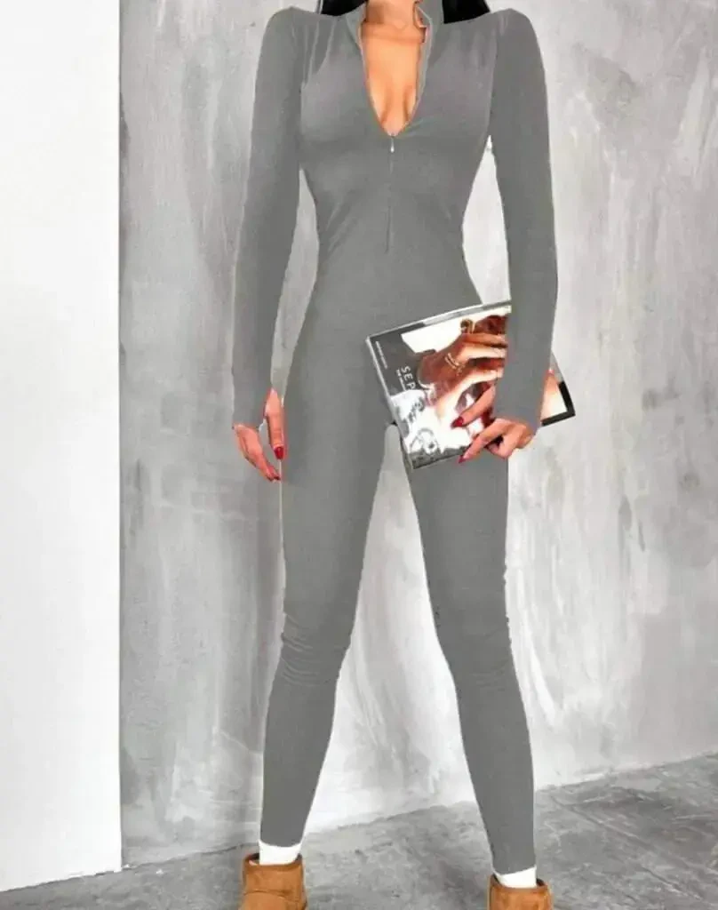 Meet the Women's Long Sleeve V-Neck Thumb Hole Detail Ribbed Jumpsuit that combines elegance and comfort! This special design jumpsuit will complement your style both in daily use and on special occasions. The V-neck detail offers an elegant look, while the long-sleeved design keeps you warm in cool weather. Thumbhole details add a modern and dynamic touch, supporting your freedom of movement. The soft texture of the ribbed fabric offers all-day comfort, while its fitted cut creates a stylish silhouette. Whether you create a casual style by combining it with sneakers or highlight your elegance with heels. This jumpsuit is a candidate to be an indispensable part of your wardrobe. The product on the model is size M/38 and the model's measurements are Height: 165, Kg: 55, Chest: 90, Waist: 72, Hips: 100. This information will give you an idea of how the product will look on you. The long leg length of the jumpsuit makes your legs look longer, while the V-neck detail elegantly emphasizes your neck. The long-sleeved design offers both a stylish look and keeps you warm in cool weather. Thumbhole details make your arms look longer and do not restrict your freedom of movement. The flexible structure of the ribbed fabric allows you to be comfortable all day long, while its fitted cut creates a stylish silhouette. This jumpsuit will complement your style both in daily use and on special occasions. Whether you create a casual style by combining it with sneakers or highlight your elegance with heels. This jumpsuit is a candidate to be an indispensable part of your wardrobe. With its cut suitable for every body type and stylish details, you will always feel special with this jumpsuit. Thanks to the softness and flexibility of the ribbed fabric, you can move comfortably all day long and enjoy comfort without sacrificing your elegance.