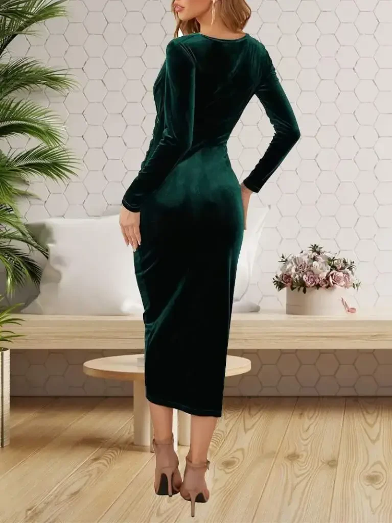 Women's Velvet Midi Dress: Wrap Neck, Ruched, Long Sleeves - Stylish and Comfortable!