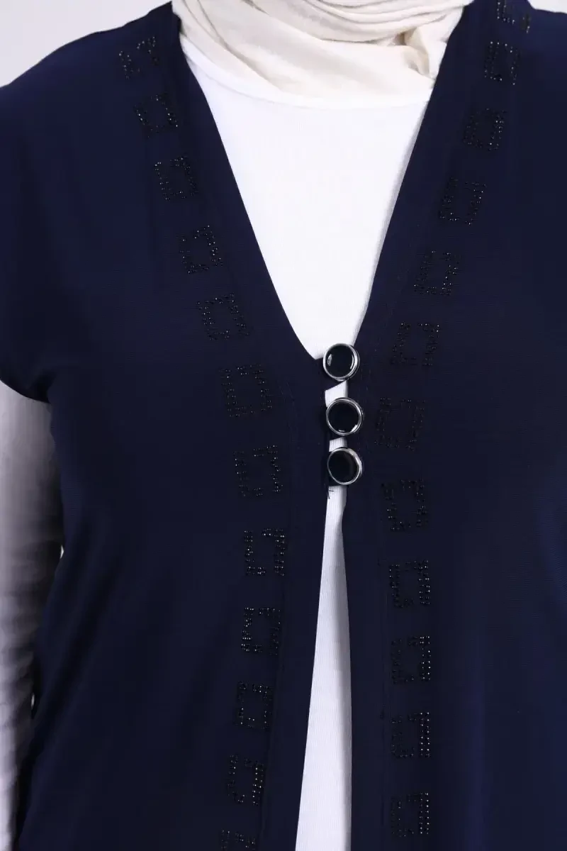 Women's Modest Lycra Buttoned Long Mother Vest Navy Blue - A special design vest that allows mothers and mothers-to-be to be comfortable without sacrificing their elegance. This vest, which you can choose for daily use as well as for special occasions, is designed in accordance with the modest clothing style. Thanks to its lycra fabric, it does not restrict your freedom of movement, while its long cut and button details offer an elegant look. Its navy blue color will easily match with any combination and will be an indispensable part of your wardrobe.Product DescriptionWomen's Modest Lycra Buttoned Long Mother Vest brings a new breath to modest clothing with its modern and elegant design. This vest, which is designed especially by keeping the comfort of mothers and mothers-to-be in the foreground, attracts attention with its lycra fabric that provides comfort throughout the day. While offering long-lasting use thanks to its high-quality fabric, its navy blue color represents elegance and nobility. The long cut of the vest provides a look that is in accordance with modest clothing principles, while at the same time elegantly covering body lines. The button details on the front add a different air to the vest and offer the possibility to be used open or closed as desired. In this way, you can create different combinations and reflect your style as you wish.This vest not only offers a stylish look, but also stands out with its practical use. This vest, which you can easily choose for both your daily activities and special invitations, will be one of the most used pieces of your wardrobe. You can easily combine it with blouses or tunics that you will wear inside and complete your elegance. The lycra structure of the vest allows you to be comfortable throughout the day without restricting your freedom of movement. Thanks to its flexible fabric, it fits your body perfectly and creates a feeling that you don't have it on.Women's Modest Lycra Buttoned Long Mother Vest is an ideal choice not only for mothers and mothers-to-be, but also for all women who adopt the modest clothing style. This vest, which offers elegance, comfort and usability together, is a must-have piece in your wardrobe. Thanks to the timeless elegance of navy blue, you can easily use it in every season and every environment. The quality of the fabric and the attention to the stitching details ensure that the vest is long-lasting, while guaranteeing that it always looks like the first day. It is now very easy to achieve both a stylish and comfortable look with this vest.Product Features* Provides freedom of movement thanks to its lycra fabric structure.* It is suitable for modest clothing principles with its long cut.* It easily matches with every combination with its navy blue color.* It offers a stylish look with its button details.* It is designed considering the comfort of mothers and mothers-to-be.* It is ideal for daily use and special occasions.* It is long-lasting thanks to its high-quality fabric.* It elegantly covers body lines.* It can be easily combined with different blouses and tunics.* It fits the body perfectly thanks to its flexible structure.* It will be an indispensable part of your wardrobe with its practical use.* It can be used in every season with its timeless elegance.* It offers a high-quality look with the attention to the stitching details.* It is easy to iron and easy to care for.Additional InformationTo use your product for a long time, please follow the washing instructions on the label. Wash the product inside out and with similar colors. Do not use bleach. Iron on low heat. Dry cleaning can be done.