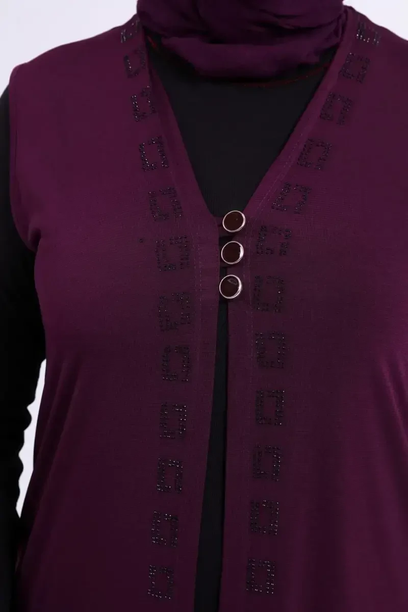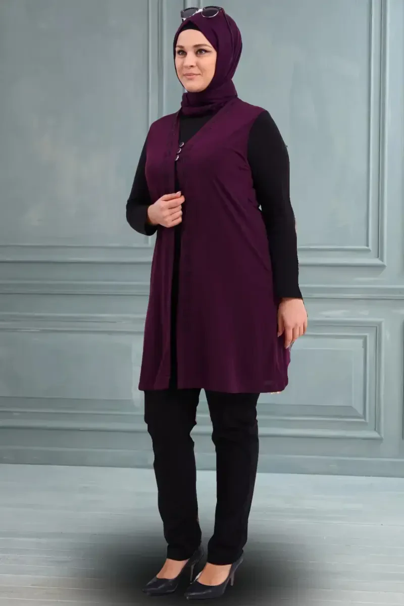 Experience elegance and comfort together with the Women's Hijab Lycra Buttoned Long Mother Vest Plum-Plum. This long vest, which is one of the most trendy hijab fashion pieces of the new season, will be an indispensable part of your wardrobe with its special design and useful details. While offering comfort all day long thanks to the lycra structure of the Mira fabric, it adapts to any environment with its stylish plum color.Our vest offers a modern look while meeting the requirements of hijab clothing with its 125 cm length. The buttons on the front make it easy to put on and take off the vest and allow you to create different combinations. The pocket detail provides both a stylish look and a practical solution for carrying your small belongings with you.The elastic detail on the cuffs allows you to move your arms comfortably and helps the vest to look better on you. This vest, which is ideal for daily use, is a piece that will complement your elegance at special occasions. Our vest, which appeals to every style with its different color and size options, is an ideal choice for women who are looking for quality and originality in hijab clothing.Enjoy being both stylish and comfortable with the Women's Hijab Lycra Buttoned Long Mother Vest Plum-Plum. This specially designed vest is a candidate to be the most loved piece of your wardrobe. Order now and own one of the most trendy products of hijab fashion.