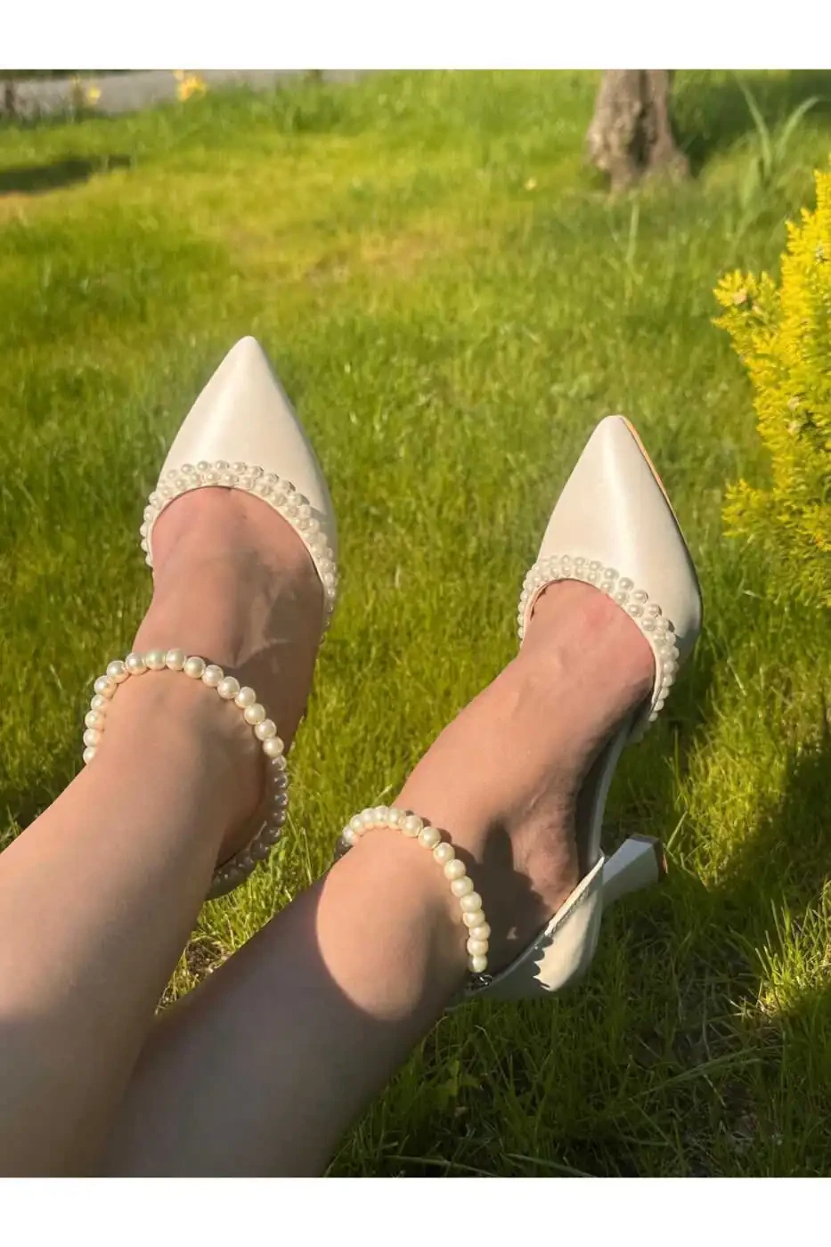 The mother-of-pearl off-white color that adorns the upper part of the shoe creates a dazzling shimmer, combining elegantly with the delicately worked pearls. The pearls complement the elegant and romantic atmosphere of the shoe, while the classic white color can match any wedding dress.