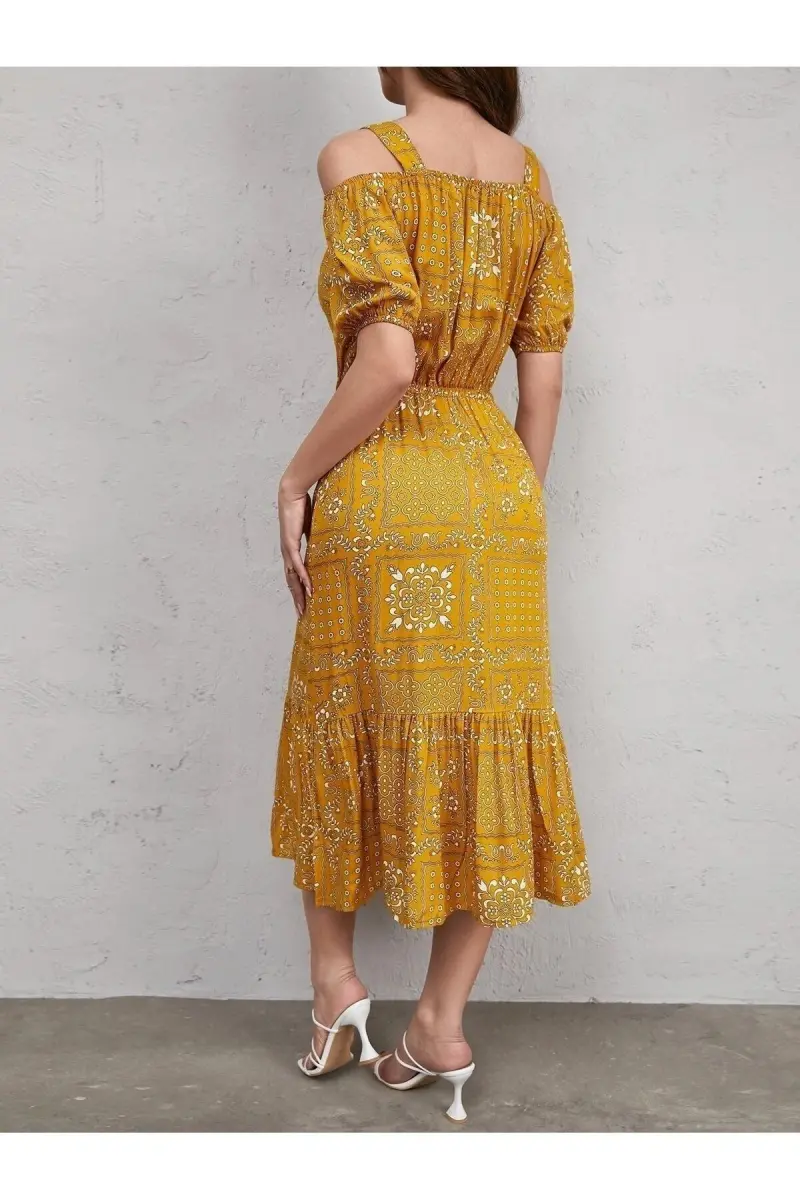 Designed for women who seek both style and comfort, this dress will become an indispensable part of your wardrobe. The mustard color and plaid floral pattern make the dress stand out, while the thin straps and elastic waist offer comfortable wear. It is an ideal choice to complete your style in everyday life, special occasions or business life.