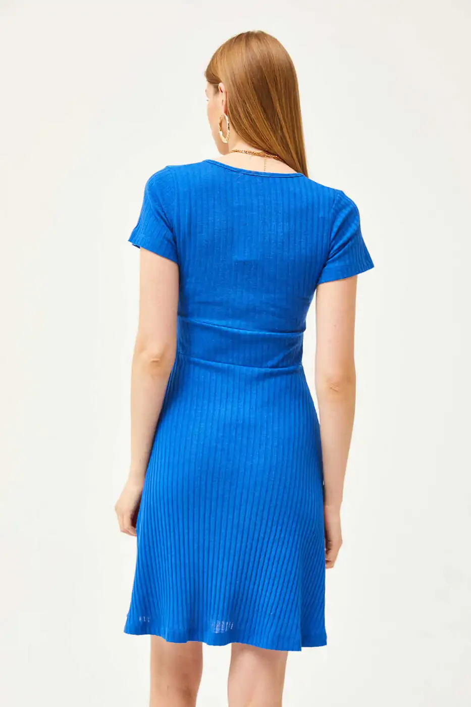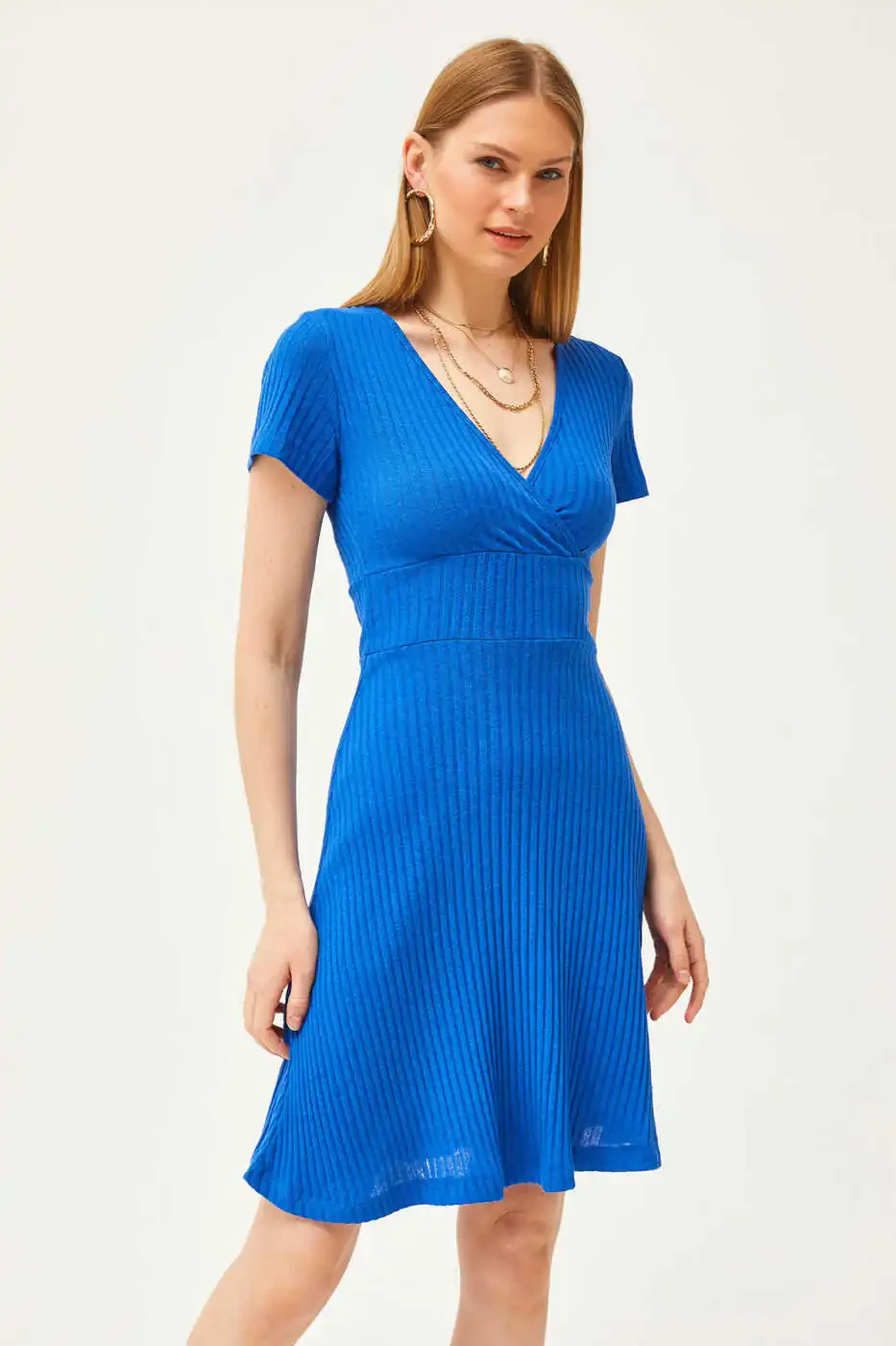 This mini A-line dress, which combines elegance and comfort, will become an indispensable part of your wardrobe. The teal blue color will suit every skin tone, the dress offers a modern look with its V-neck and short sleeves.