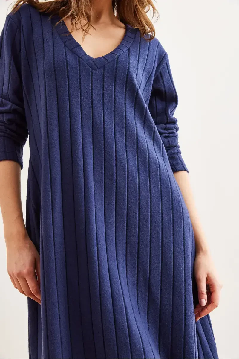 Women's Navy Blue Thick Ribbed V-Neck Mini Dress is a timeless piece that combines elegance and comfort and can be worn in any season. Its thick ribbed texture, fitted cut, and striking V-neck create a feminine silhouette. This dress, which you can easily prefer for special occasions as well as daily use, is a candidate to be an indispensable part of your wardrobe.Product DescriptionWomen's Navy Blue Thick Ribbed V-Neck Mini Dress offers a modern and elegant look while prioritizing comfort. This dress, which promises long-lasting use thanks to its high-quality and durable ribbed fabric, creates a perfect silhouette by fitting nicely on the body. The nobility of the navy blue color, the attractiveness of the V-neck, and the energy of the mini skirt length come together to make you stand out in any environment. Whether you create a stylish combination with high heels or catch a more comfortable style with sneakers, this dress can easily adapt to any style. You can also use this piece by wearing a jacket or cardigan on it in cold weather, and it stands out with its wearability in all seasons. It can be an ideal choice for a special dinner, as well as accompany you in daily hustle and bustle. This dress, which you can easily combine with your accessories, offers the perfect ground for you to reflect your personal style. This dress, designed for women who are looking for both elegance and comfort, will be one of the most loved pieces of your wardrobe. With the quality of its fabric, the care of its seams, and the modernity of its design, this dress, which you can enjoy for many years, is one of the basic pieces that every woman should have. The timelessness of the navy blue color makes this dress a timeless investment. Whether you achieve a classic look or create a more trendy style, this dress always ensures you look stylish and well-groomed. If you are looking for a versatile piece that can be worn at any time of the day, the Women's Navy Blue Thick Ribbed V-Neck Mini Dress is for you. This dress will always make you feel special by offering both comfort and elegance.Product Features* Thick ribbed fabric* V-neck design* Mini skirt length* Body-hugging fit* Navy blue colorAdditional InformationThe size on the model is S/36. The product content is 95% Cotton, 5% Elastane. Can be washed at 30 degrees. Can be ironed at low heat. Do not bleach. Dry cleaning can be done.
