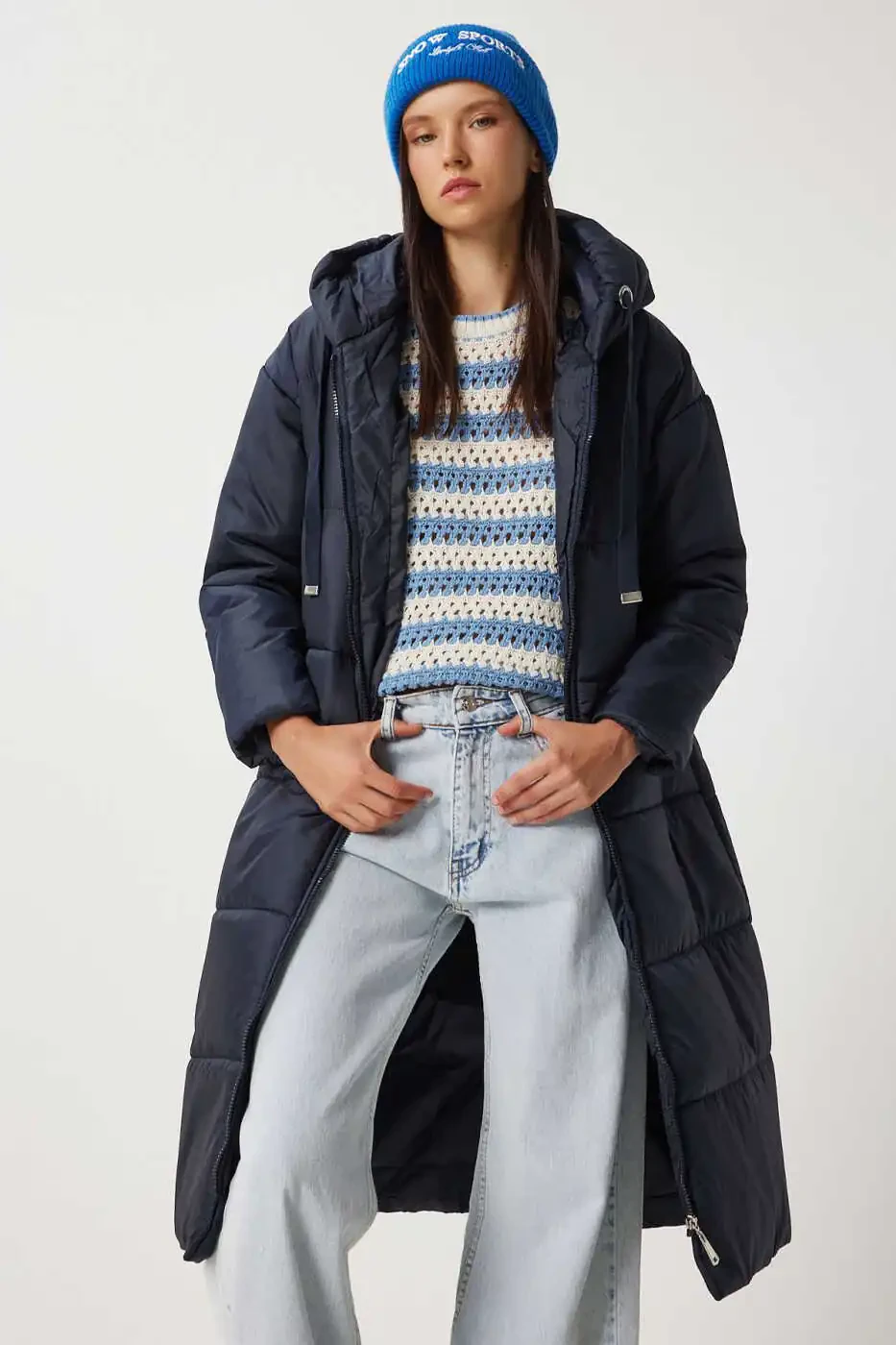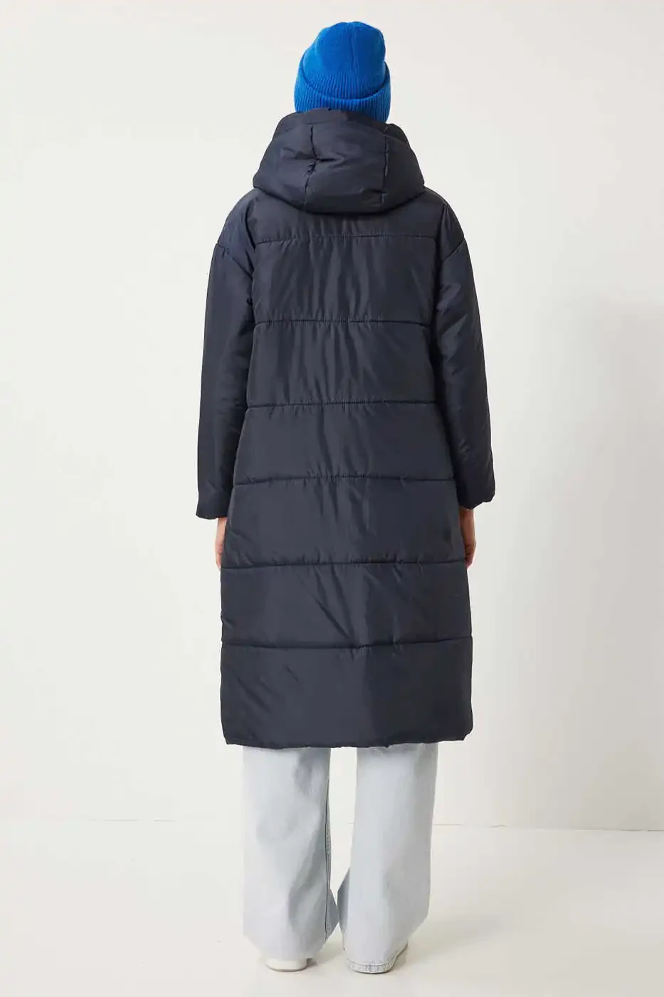Meet the Women's Navy Blue Hooded Long Puffer Jacket DD01006, the indispensable item for cold weather that combines elegance and comfort! Offered with the assurance of [page="merchant_info"]Trendyol[/page], this special design is designed to accompany you in both your daily life and special moments. The navy blue color, which attracts attention with its modern and elegant appearance, offers a timeless elegance that suits every style. The puffer silhouette both keeps you warm and gently wraps your body contours, giving you a slimmer look. This jacket is not just a piece of clothing, but also a reflection of your style and lifestyle. This unique product, offered at campaign prices, will be one of the most valuable pieces of your wardrobe. Moreover, you are offered a wide range of options with a stock of more than 50 units. Remember, this jacket will not only keep you warm, but will also dazzle with your stylish stance.