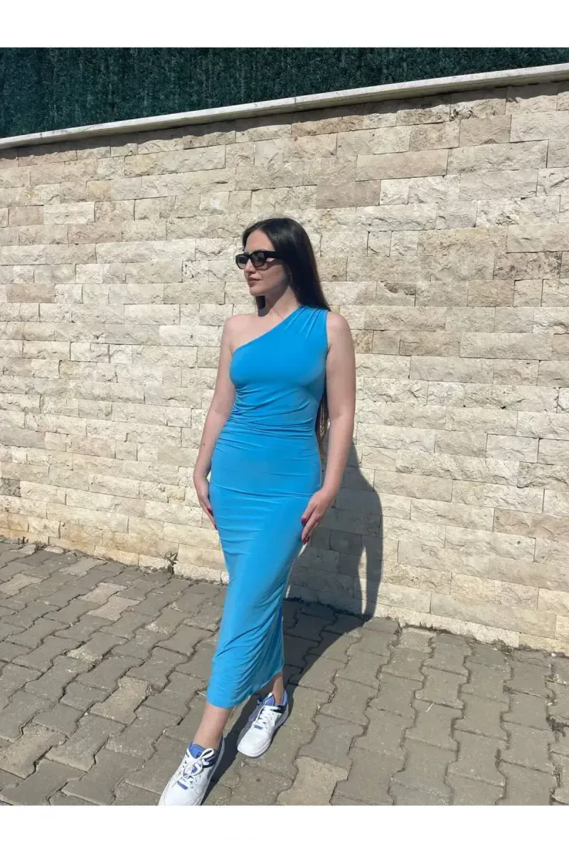 Women's One Shoulder Ruched Midi Dress - Sea Blue | Stylish and Elegant Design
