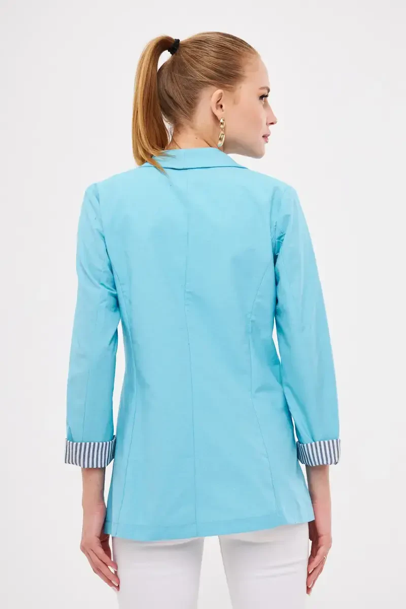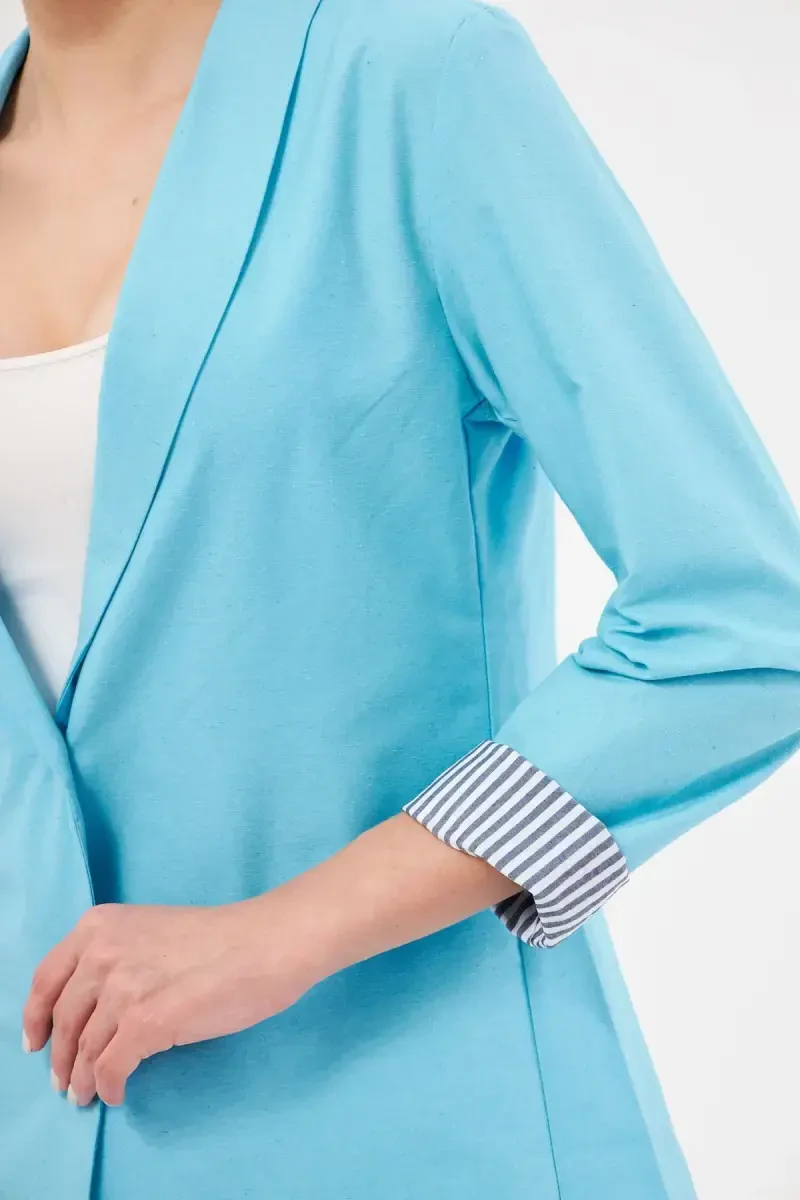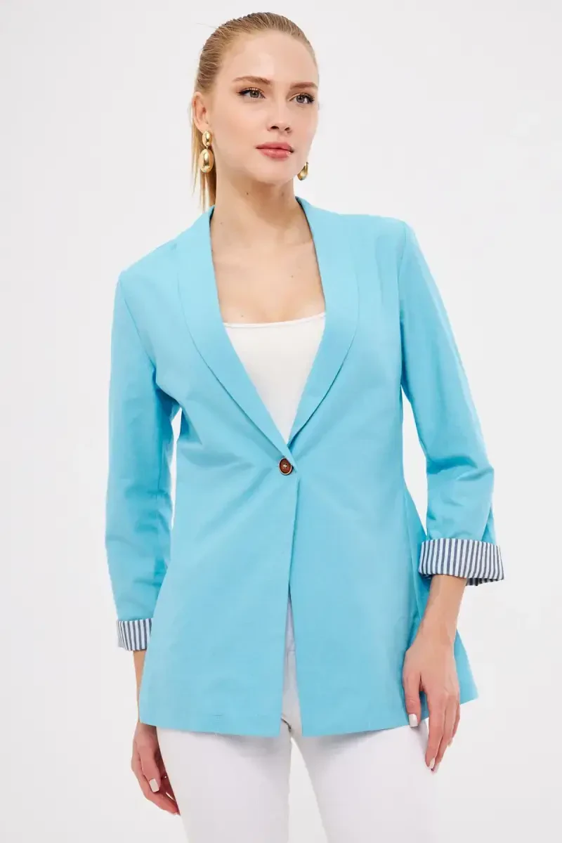 Take your style to a whole new level with Armonika's Women's Light Turquoise Striped Inner Sleeve Single Button Jacket, where elegance and comfort come together. This special design jacket draws attention with its light turquoise color and elegant striped details on the inside of the sleeve. This jacket, which is an ideal option for both daily use and your special occasions, is a candidate to be an indispensable part of your wardrobe. The single button detail adds a modern touch to the jacket, while its comfortable cut offers all-day comfort. Whether you create a sporty combination with jeans or combine it with an elegant dress to achieve a sophisticated look, this jacket easily adapts to any style. This jacket, produced with Armonika quality, is carefully designed for long-lasting use. The fact that its fabric is a mixture of 50% cotton and 50% polyester provides both breathability and durability. In this way, your jacket maintains its elegance as on the first day for many years. Discover this unique jacket now and complete your style with Armonika difference. Remember, only a limited number of these specially designed jackets have been produced. Hurry to take advantage of the campaign price and add this unique piece to your wardrobe. Armonika aims to offer you the best experience by combining elegance and quality. Reflect your style with this jacket and enjoy all-day comfort. We would also like to state that our product is offered with Trendyol assurance and has easy return options. You can visit our return conditions page for detailed information. Follow fashion closely with Armonika and always stay stylish.