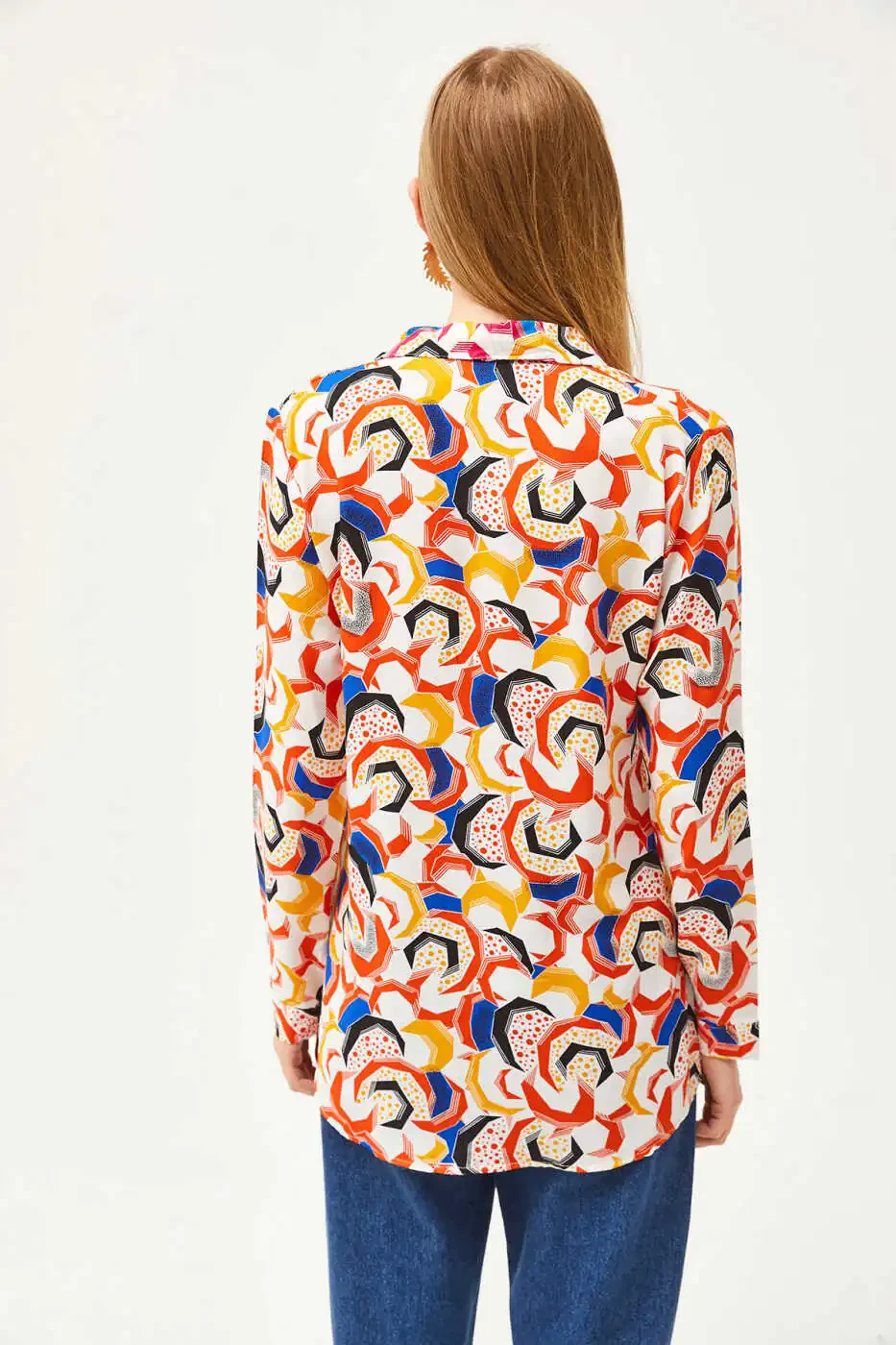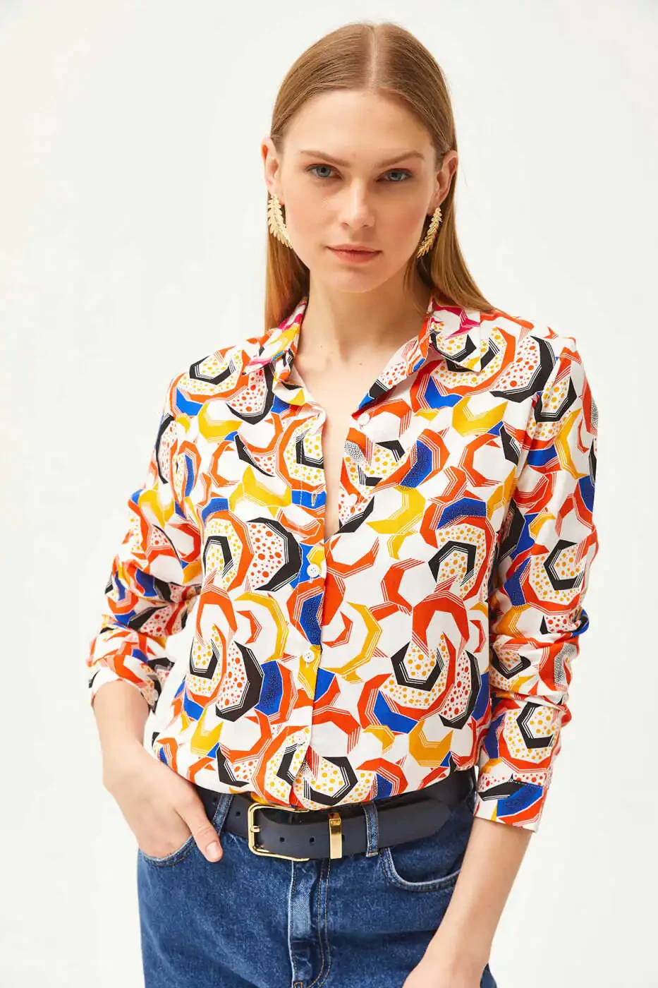 This orange geometric patterned shirt, which combines style and comfort, will be an indispensable part of your wardrobe. With its soft texture and breathable fabric, this shirt, which you can comfortably use in every season, is an ideal choice to complete your daily combinations.