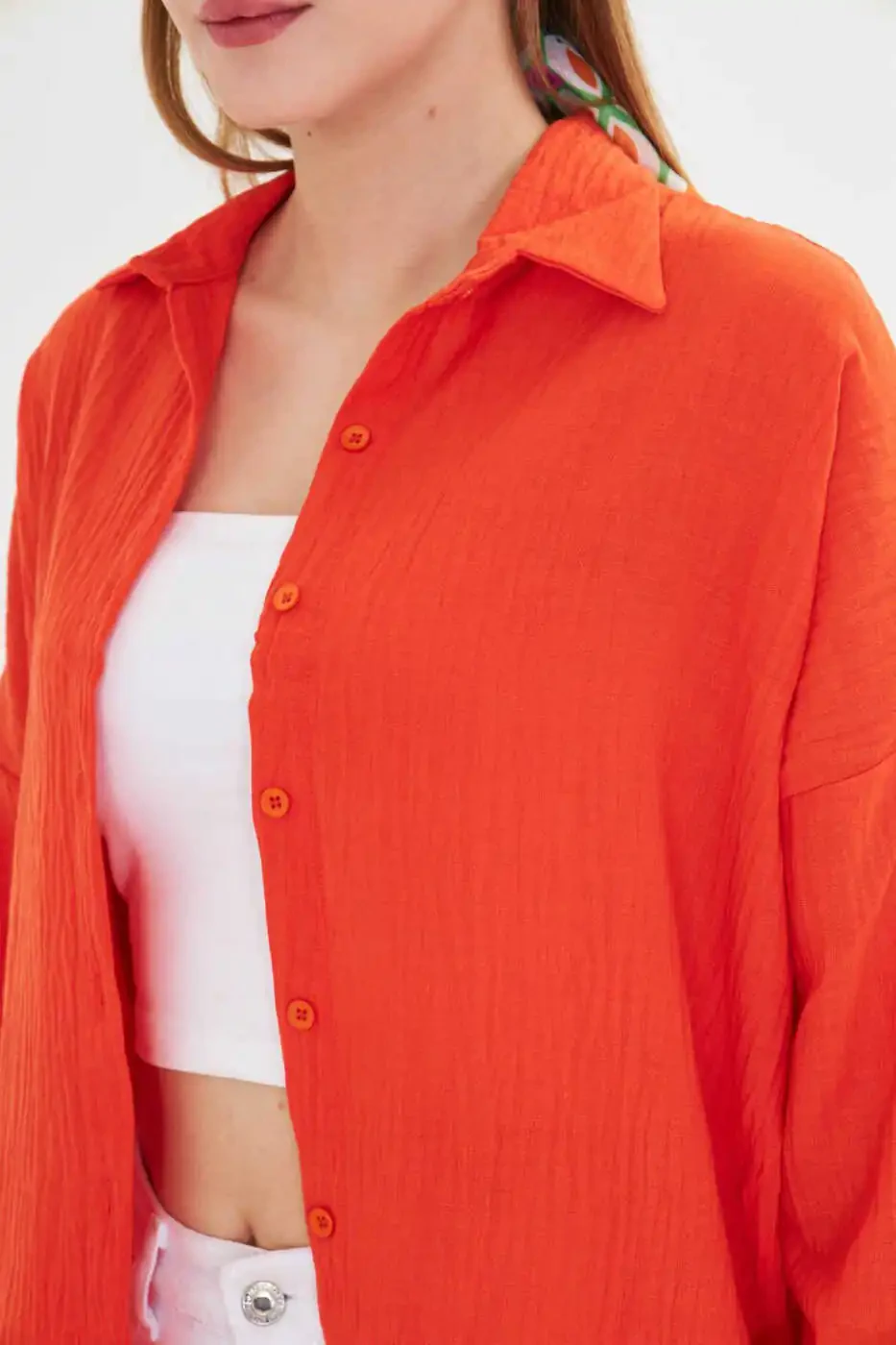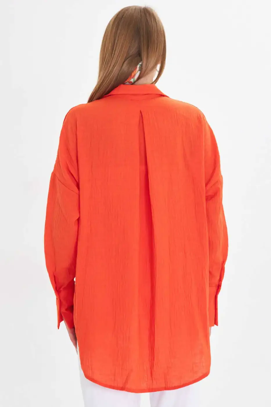 A perfect choice for those looking for a style that offers both elegance and comfort, empowering women with confidence: Orange Oversized Textured Linen Look Wide Cuff Shirt! It will elevate your everyday outfits, reflect your unique style, and add a sophisticated touch to your look.
