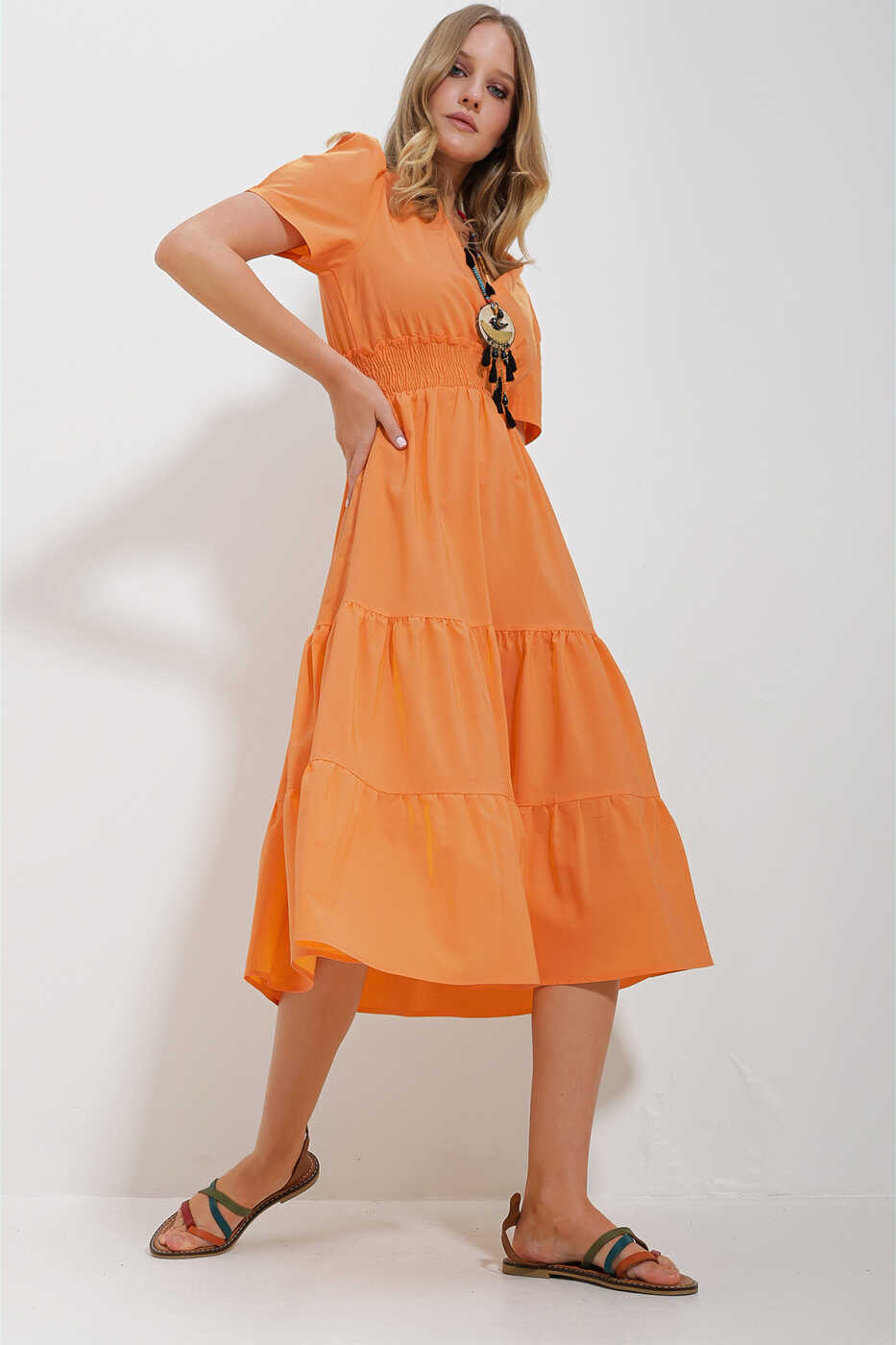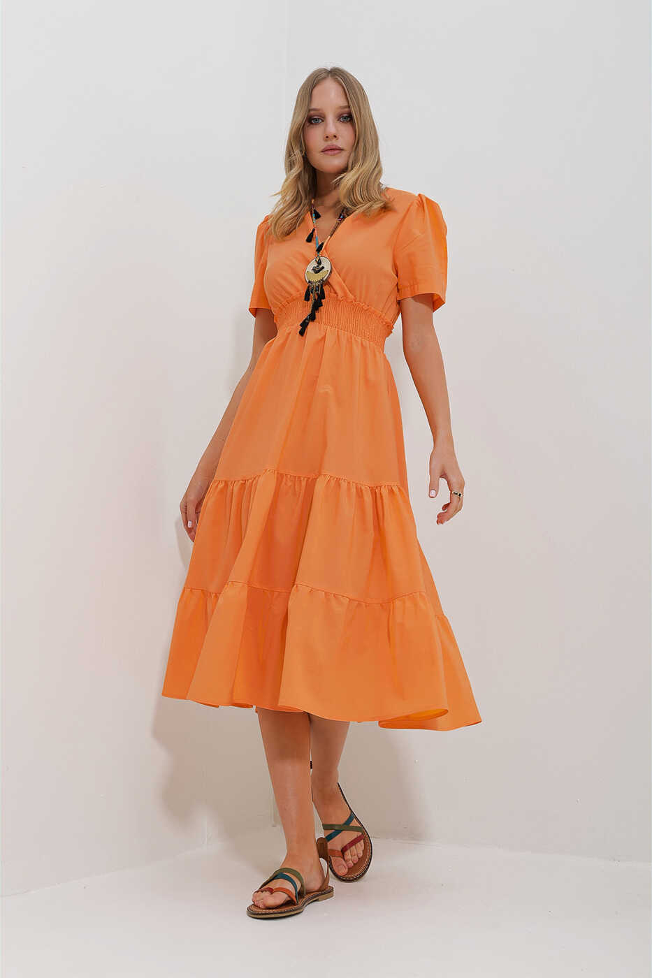 This orange dress, combining elegance and comfort, is poised to become your new wardrobe favorite. Featuring a wrap neckline and waist belt design, the dress offers a sophisticated look and is crafted from pleated woven poplin fabric. Its lightweight and breathable fabric provides comfortable wear throughout the day.