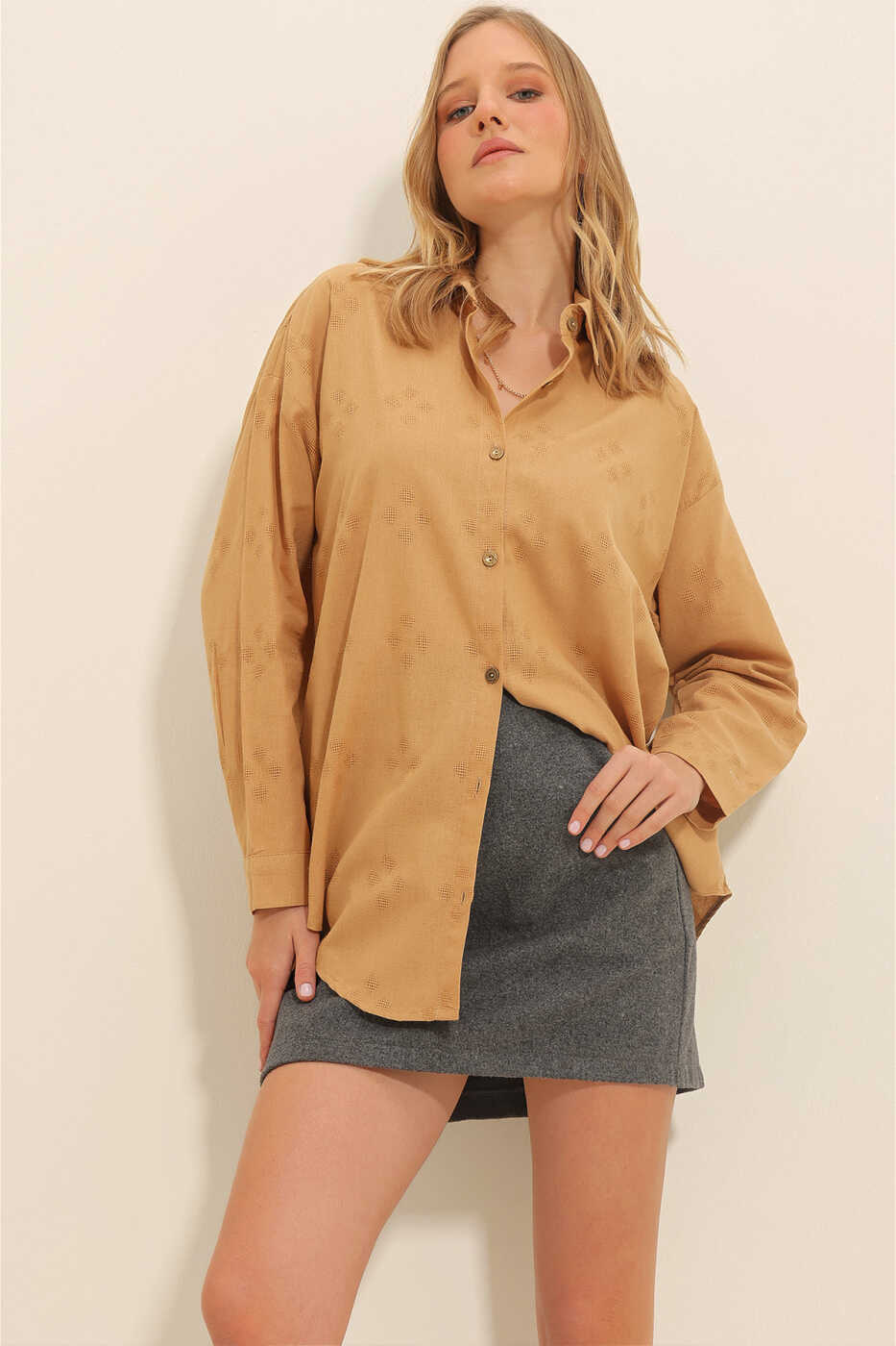 Meet the ALC-X11288 women's oversize linen shirt with biscuit pattern, a combination of comfort and style that's essential for summer! Made from lightweight and breathable linen fabric, this shirt offers comfortable wear throughout the day. Its oversize cut provides a relaxed fit, while the crew neck and front button closure add a touch of elegance. The biscuit pattern reflects the energy of summer and makes you stand out.