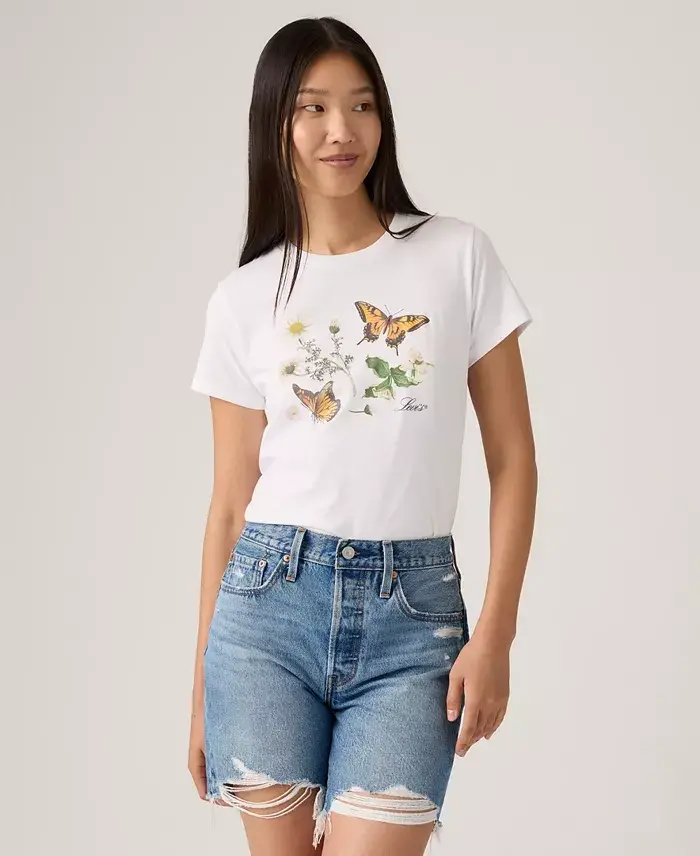 Women's Perfect Graphic Logo Cotton T-Shirt - Butterflies On Daisies Bright White