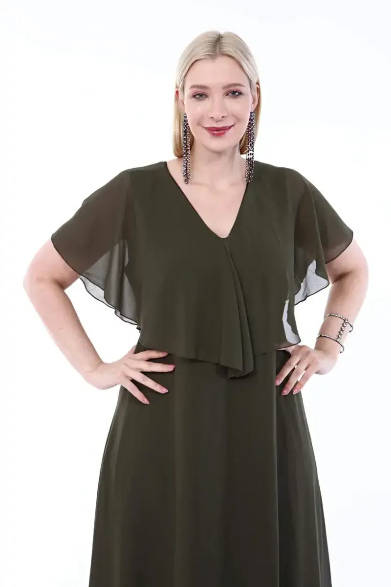 Women's Plus Size Chiffon V Neck Caped Dress KL3065 Khaki