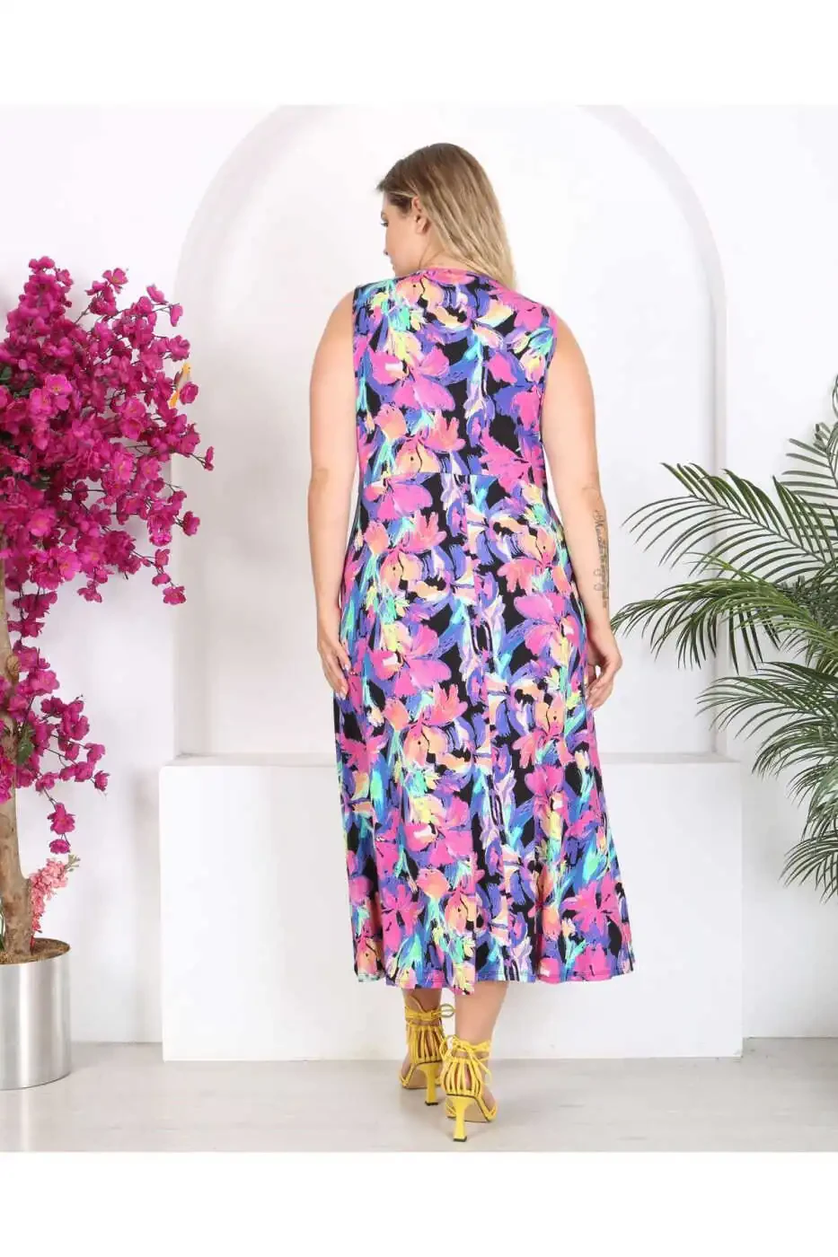 Designed for women who seek both style and comfort, this maxi dress is the perfect choice to complete your look. With its watercolor print, it has a vibrant and eye-catching appearance, while its sleeveless design and V-neck add a touch of elegance to your style. The dress, with its plus size options, fits every body type and is a piece that you can comfortably wear anywhere, from everyday life to special occasions.