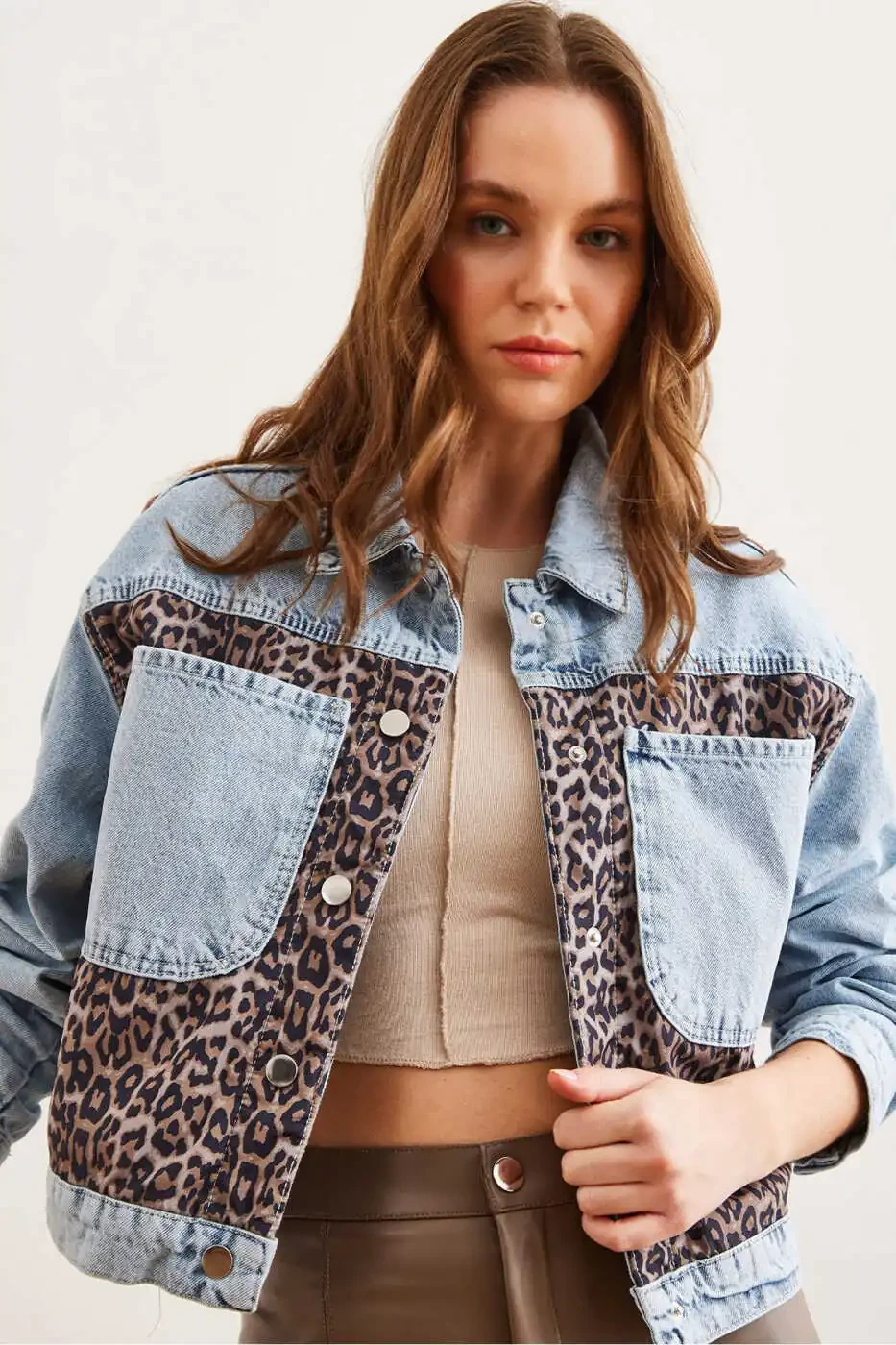 **Women's Blue Pocketed Leopard Detailed Premium Denim Jacket**