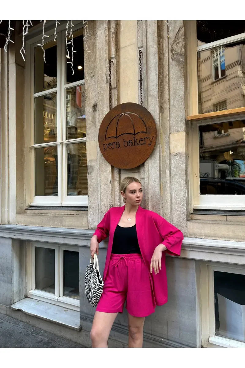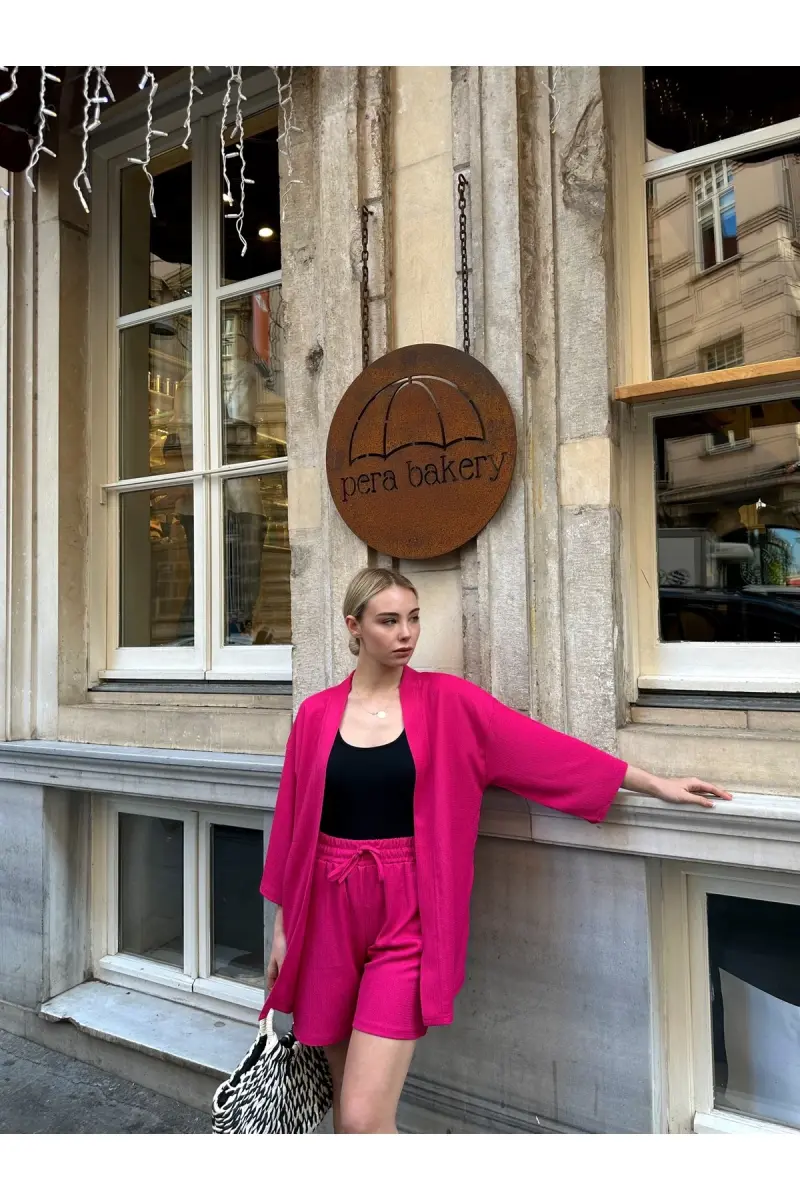 Women's Printed Off-Shoulder Short Kimono Set - Pink, a combination that brings together elegance and comfort, will be indispensable for summer. With its light fabric and modern design, it allows you to express your style both in daily use and on special occasions.Product DescriptionWomen's Printed Off-Shoulder Short Kimono Set - Pink, is a candidate to be the most beloved piece of your summer wardrobe. This stylish and comfortable set is a perfect option both for relaxing at home and going out with friends. The most striking feature of the set is its kimono-style top piece. The off-shoulder design adds a feminine touch, while its wide cut offers freedom of movement throughout the day. The vibrant prints on it add an energetic and fun atmosphere to the set, while the pink color reflects the warmth of summer. The shorts are in perfect harmony with the kimono. The high-waisted cut makes the legs look longer, while the comfortable fabric provides all-day comfort. Whether you get a casual look with sneakers or create a more stylish combination with sandals, this set easily adapts to any style. Its light and breathable fabric prevents sweating in hot weather and keeps your skin comfortable. This set, which will be one of the first pieces you put in your suitcase on vacation, also allows you to maintain your elegance on the beach. While walking on the beach at sunset or sunbathing by the pool, you will feel both comfortable and stylish with this set. This set, which is also very easy to care for, is machine washable and dries quickly. Thus, it saves you time on your summer vacation or in your daily life. This set, which will be indispensable for your wardrobe, will please you not only with its elegance but also with its ease of use. You can create your own style by combining it alone or with different pieces. Enjoy the summer with the Women's Printed Off-Shoulder Short Kimono Set - Pink!Product Features* Light and breathable fabric* Off-shoulder kimono-style top piece* High-waisted shorts* Vibrant and energetic prints* Comfortable and stylish design* Pink color* Suitable for daily use and special occasions* Machine washable* Quick drying feature* Wide cut that provides freedom of movementAdditional InformationThe size on the model is S/36. Different size options are available. Fabric content: 100% Polyester. Please follow the washing instructions. The product can be easily paired with other clothing pieces to create different combinations.