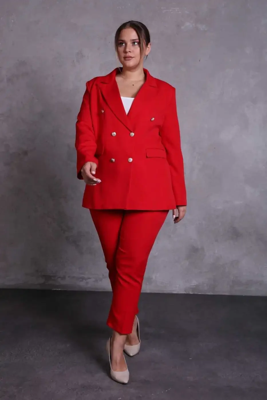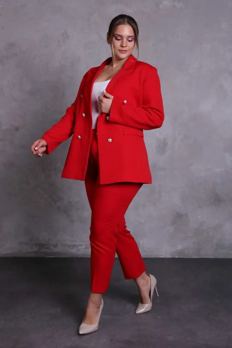 women's suit, red blazer jacket, plus size suit, belted trousers, straight leg trousers, stylish suit, women's clothing