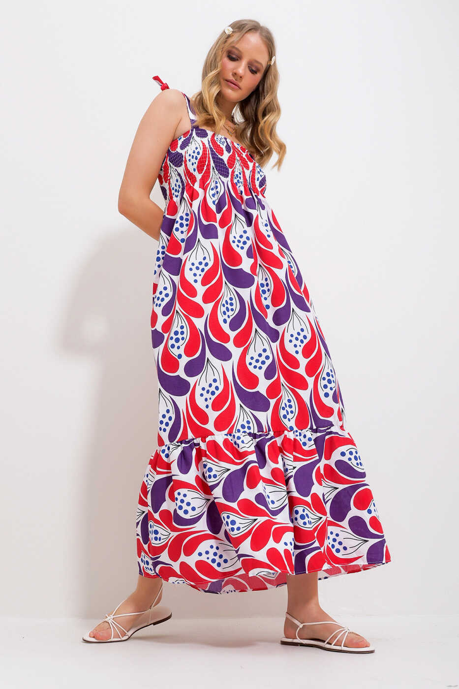 Offering an elegant silhouette with its thin straps and ruffled skirt, the dress draws attention with its vibrant red color and eye-catching floral pattern. Its embroidered fabric texture combines both style and comfort.