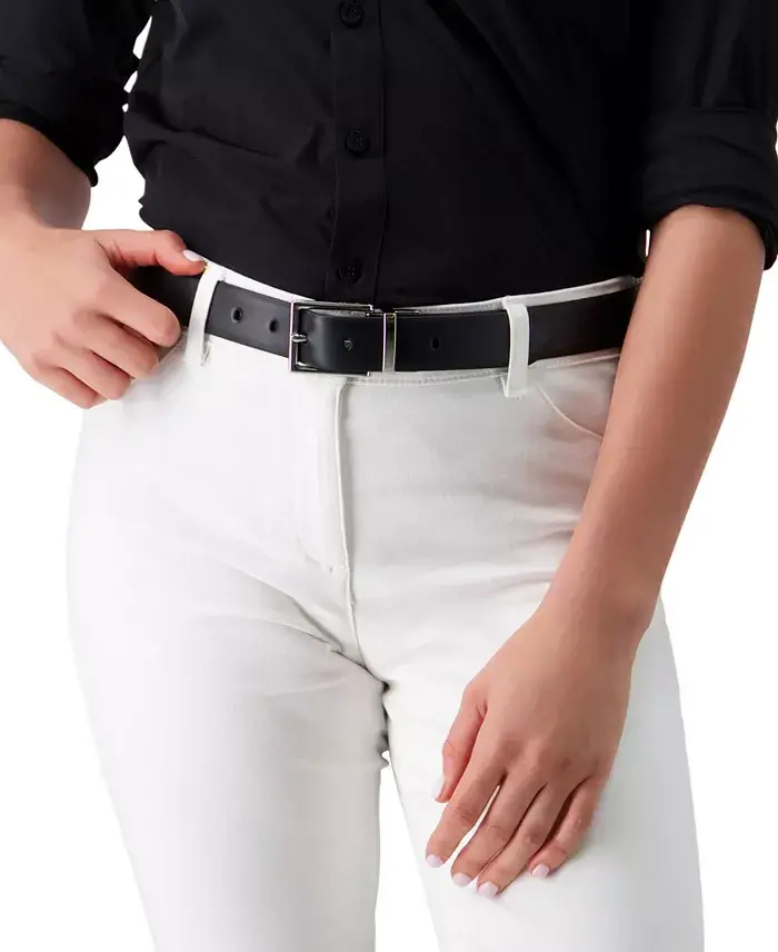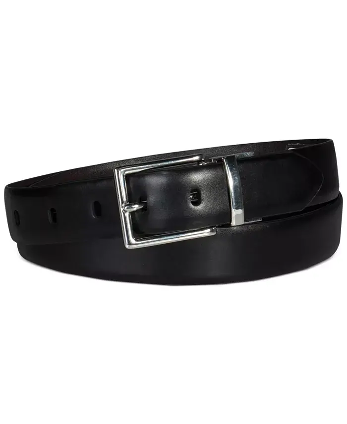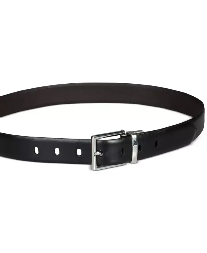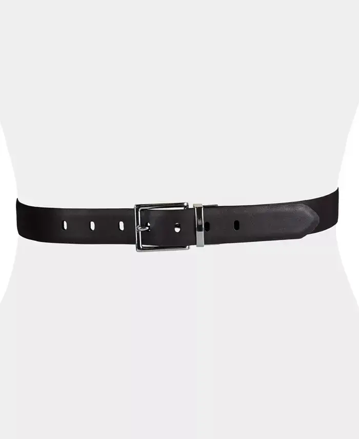 Change your look with a flip with this stylish reversible belt from Calvin Klein. Approx. length: S: 39"; M: 41"; L: 44"; XL: 47"; Approx. width: 1-1/4" Reversible, rotative buckle with double-sided strap 1-prong harness buckle; English tip; 7 holes on strap Polyurethane/leather Spot clean Imported