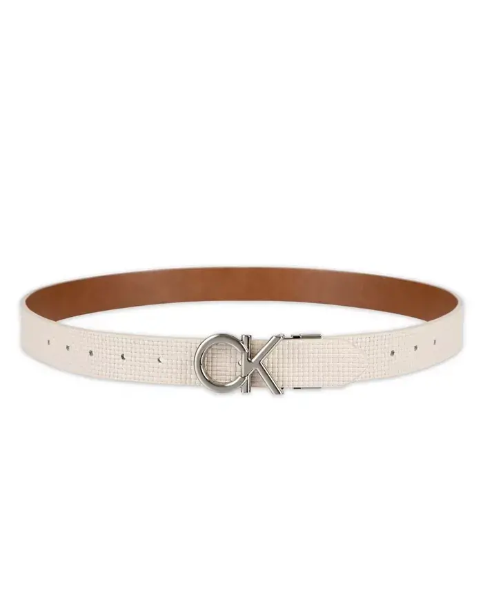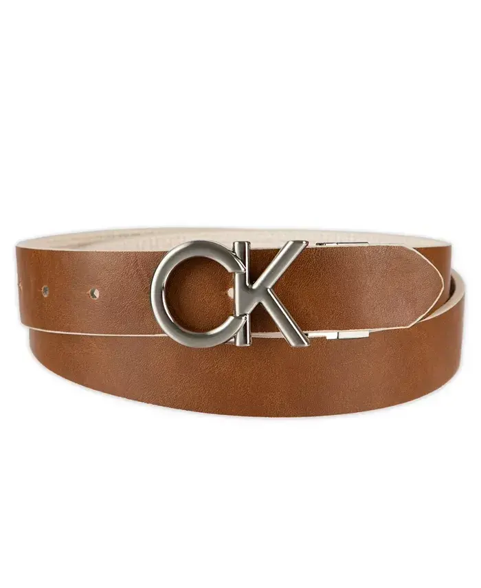 Calvin Klein sleek belt is sure to be a staple in your closet. The puffed, bubble letter style CK monogram buckle will bring attention to your waist, while the reversible style gives you double-sided versatility. Approx. length: S: 37"; M: 39"; L: 41"; XL: 44" Approx. width: 1-1/4" Ball prong closure CK monogram buckle in puffed letter design; rotative buckle mechanism; pull up buckle at hinge and twist to switch strap sides Reversible style Polyurethane, leather Spot clean Imported