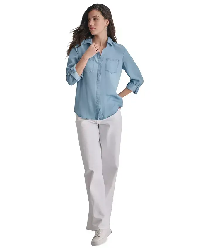 Framed by adjustable roll-tab-sleeves for added style versatility, DKNY Jeans button-front shirt instantly brings a pop of color to any outfit. Approx. model height is 5'10" and she is wearing a size small Relaxed fit; approx. 27" long Point collar; front button closures Patch pockets at chest; slit at back vent Long roll-tab sleeves; buttoned cuffs 100% Lyocell Machine wash Imported