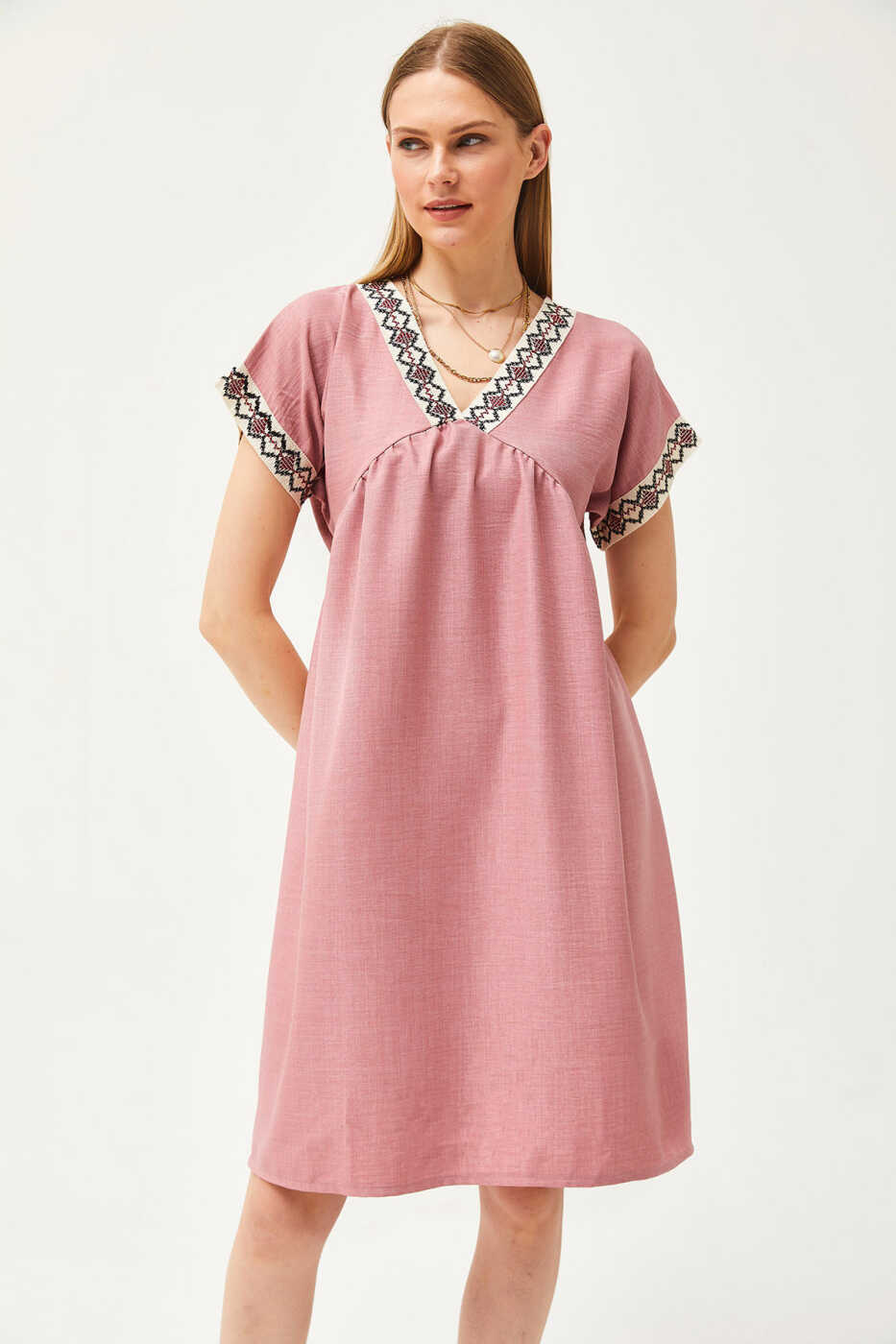 The Women's Rose Neck Lace Detail Linen Blend Dress is a must-have for summer, combining style and comfort. The dress offers a stunning look with its rose color, while its linen content provides a breathable and cool feel. Featuring a V-neck and a lace-detailed top, the dress adds a feminine touch and is a stylish choice for everyday wear or special occasions.