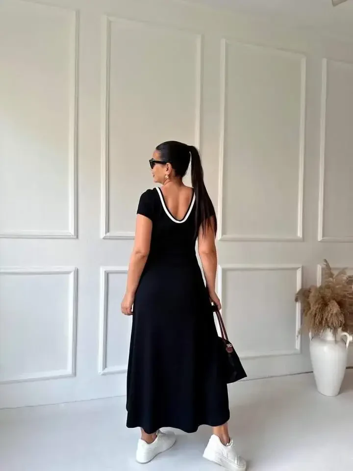 women's dress, viscose dress, white dress, slit dress, full-length dress, ribbed collar, round neck, casual dress, chic dress, summer dress