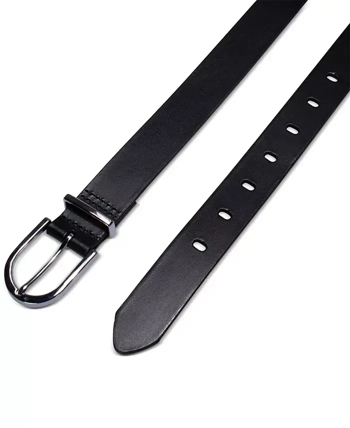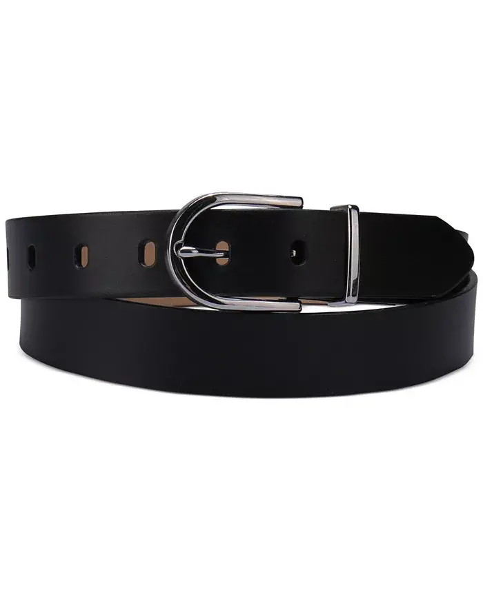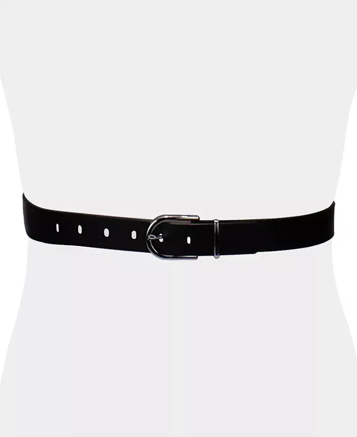 For a subtle touch of style, this Calvin Klein women's belt will do just the trick and oblong strap holes make this casual belt a closet essential. Approximate wide strap- 1.18" with English tip shape Approximate length- small (4-6), medium (8-10), large (12-14), x-large (14-16) Rounded harness buckle closure Metal strap keeper loop 7 holes on strap for adjustable fit Embossed Calvin Klein logo on lining Belt is available in plus sizing up to 3X Leather, Polyurethane Spot Clean Imported