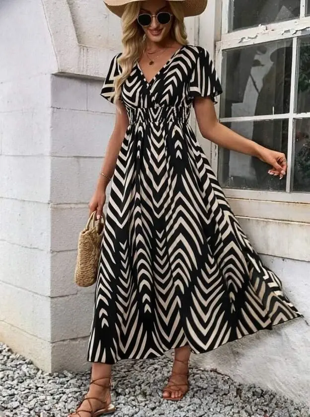 Designed to add elegance and movement to your wardrobe, the Women's Short Ruffle Sleeve Wrap V-Neck Elastic Waist Patterned Maxi Dress is created both to complete your daily elegance and to dazzle on your special occasions. Attracting attention with its modern cut and aesthetic details, this dress offers unique comfort that will accompany you in every step. While the wrap V-neck detail keeps the décolleté at an ideal level, it also helps your neck area appear more elegant and slender. The short ruffle sleeves add a feminine and romantic vibe to the dress, allowing you to achieve an energetic look. Thanks to its elastic waist design, it fits your body perfectly and supports an hourglass silhouette by gently highlighting your waistline. Matching perfectly with both your sandals and high heels due to its long length, this piece is a candidate to be the essential of seasonal transitions and hot summer days. Its quality fabric structure keeps you cool with its breathable texture throughout the day, while its unique patterns ensure you draw attention. This dress, with which you can effortlessly achieve elegance at a chic dinner, friend gatherings, or weekend trips, will become one of the favorite pieces in your closet. Admired for its fit on the model, this dress appeals to all body types with different size options. If you want to feel special and comfortable at every moment, you should definitely add this elegant dress to your wardrobe.