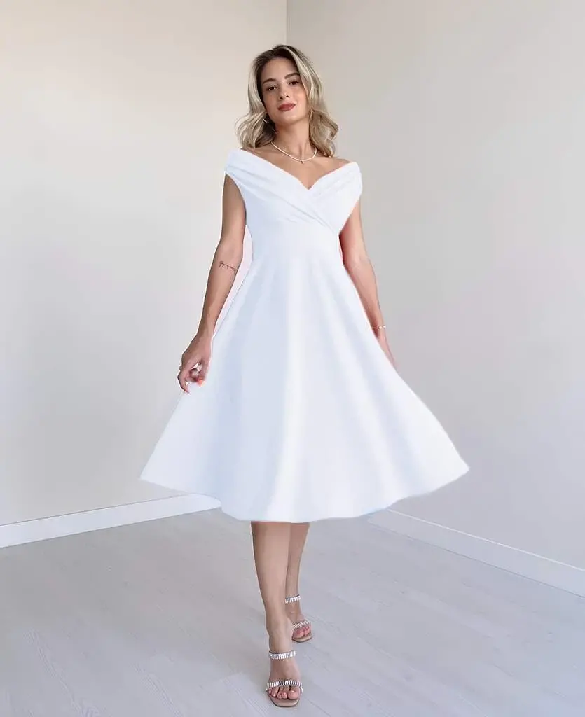 Meet the Women's Short Sleeve Wrap V-Neck Ruffle Hem Crepe Dress, an essential for your summer wardrobe that combines elegance and comfort. This special design dress will highlight your elegance in both daily use and special occasions. Thanks to its light and breathable crepe fabric, it offers a comfortable use even in hot weather, while creating a feminine silhouette with its wrap-over collar detail and flounced skirt design. The short sleeves of the dress provide an elegant look without restricting your freedom of movement. The natural drape of the crepe fabric gently wraps your body lines, helping you achieve a flawless look. The flounced hem adds movement and dynamism to the dress, ensuring you attract attention with every step. The wrap-over collar detail elegantly emphasizes your décolleté and completes your elegance. This dress can be easily combined with different accessories and shoes. You can achieve a comfortable elegance with sandals or sneakers for daily use, and complete your combination with heels and a stylish bag for a special occasion. Thanks to the lightness and easy ironing feature of the crepe fabric, it will be a piece that you will not want to leave out of your luggage on your travels. The color options of the dress have been carefully selected to appeal to every style and taste. This collection, where you can find classic and timeless colors as well as the trendy colors of the season, is a candidate to be the most loved piece of your wardrobe. The Women's Short Sleeve Wrap V-Neck Ruffle Hem Crepe Dress is not just a piece of clothing, but also a style statement. Make a difference in any environment with this dress that will make you feel special and beautiful. Enjoy the summer to the fullest with this design that will highlight your elegance and confidence. The cut of the dress is designed to fit every body type. The wrap-over cut that emphasizes the waistline helps you achieve a slimmer and more elegant look. The flounced design of the skirt hides imperfections in the hip area, creating a more balanced silhouette. This dress is a must-have in the wardrobe of both young and mature women. Thanks to its timeless design, it will be an investment that you can use for years without going out of fashion. The quality of the crepe fabric offers long-lasting use and ensures that the colors retain their vibrancy. The stitching details of the dress are made with meticulous workmanship and increase its durability. Enjoy being both stylish and comfortable with the Women's Short Sleeve Wrap V-Neck Ruffle Hem Crepe Dress. This special design is a candidate to be the most loved piece of your wardrobe.