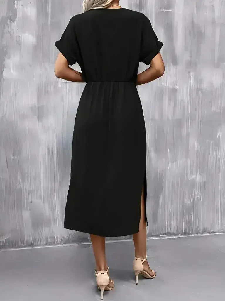 Women's Short Sleeve Low Cut Tie Waist Slit Viscose Dress has a striking design that offers elegance and comfort together in hot weather. This dress offers comfortable use all day long thanks to the lightness and soft texture of the viscose fabric. The low-cut neckline and tie waist detail emphasize your feminine silhouette, while the slit detail adds elegance to your elegance without restricting your freedom of movement. Whether for daily use or a special occasion, you can always look stylish with this dress. The short-sleeved design of the dress is a must-have for summer, while the tie waist detail perfectly emphasizes your body lines. The slit detail adds a modern and attractive touch to the dress, while the flowing structure of the viscose fabric adds a delicate touch to your movements. This dress is a candidate to be one of the most loved pieces of your wardrobe. The product on the model is size M/38. Model Measurements: Height: 165, Kg: 55, Chest: 90, Waist: 72, Hips: 100. These measurements can give you an idea of how the dress will look on you. The breathable structure of the viscose fabric prevents sweating in hot weather and provides a gentle touch to your skin. The design of the dress is specially designed to fit different body types. Thanks to the tie waist detail, you can adjust the dress according to your own body measurements and create the silhouette you want. The slit detail reveals your legs elegantly and adds freedom to your movements. This dress is an ideal choice for women who want to be both stylish and comfortable. You can create a casual style by combining it with sandals or sneakers for daily use, and you can achieve a glamorous look by combining it with high heels and stylish accessories for a special occasion. Taking care of the dress is also quite easy. Thanks to the durable structure of the viscose fabric, you can use it like the first day for many years. You can machine wash the dress or have it dry cleaned. However, due to the delicate structure of the viscose fabric, it is recommended to wash and iron it at low temperatures. In this way, you can preserve the color and texture of the dress and ensure it lasts longer. Women's Short Sleeve Low Cut Tie Waist Slit Viscose Dress is a timeless piece that every woman should have in her wardrobe. Order this dress now, which will always satisfy you with its elegance, comfort and ease of use, and bring a new breath to your style.