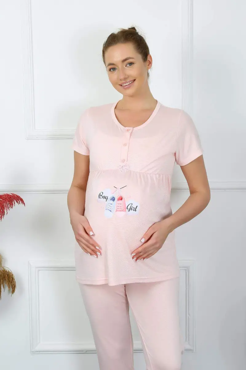 **Women's Short Sleeve Maternity Pajama Set Powder 45210**Our product is made of 100% cotton and is a product that you can use with peace of mind during pregnancy and postpartum periods. Thanks to its comfortable pattern and flexible fabric, it offers a comfortable use throughout the day. The set consists of a short-sleeved top and long pants.**Product Features:*** 100% Cotton* Designed for pregnant and postpartum mothers* The size on the model is size M**Size Options and Measurements:**| Size | Bust (cm) | Waist (cm) | Height (cm) | Hips (cm) | Pants Length (cm) ||---|---|---|---|---|---|| M | 97 | 114 | 70 | 126 | 101 || L | 100 | 117 | 70 | 132 | 101 || XL | 103 | 120 | 70 | 138 | 101 || 2XL | 106 | 123 | 70 | 144 | 101 || 3XL | 109 | 126 | 70 | 150 | 101 || 4XL | 112 | 129 | 70 | 156 | 101 |**Order and Delivery:*** All your orders are shipped within 24 hours.* Your order will be delivered within an estimated 2-5 business days.
