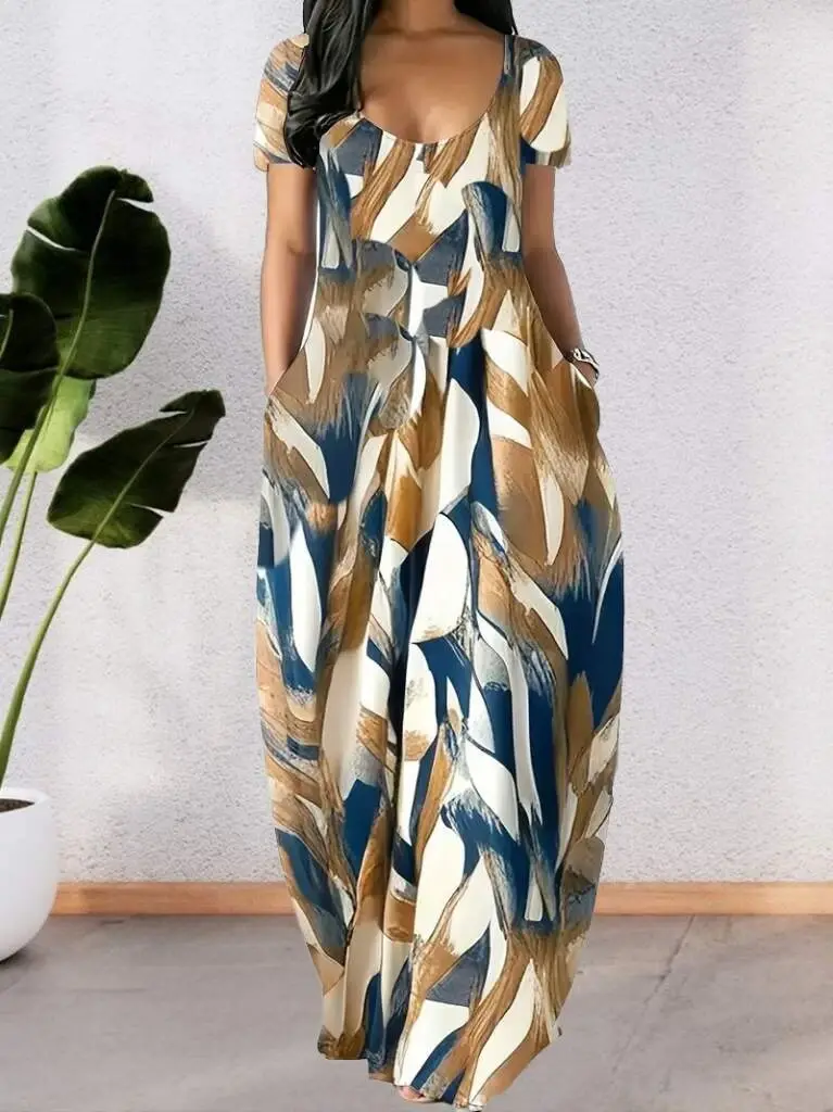 woman dress, short sleeve dress, round neck dress, pocketed dress, loose dress, printed dress, supreme dress, casual dress, summer dress, comfortable dress