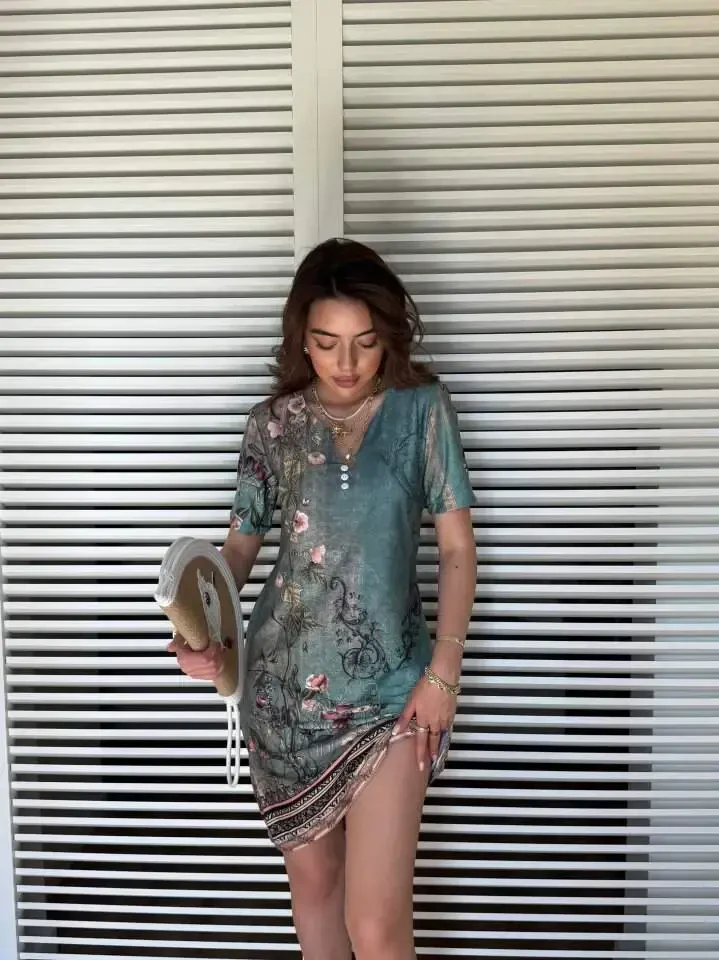 Reflect the energy of summer in your style with the Women's Short Sleeve V-Neck Floral Print Midi Supima Dress! Combining modern design and comfort, this dress is a candidate to be the most loved piece of your wardrobe. The V-neck offers an elegant décolleté, while the short sleeve design keeps you cool in hot weather. The vivid and eye-catching floral prints that adorn the dress will add joy and vibrancy to every combination. Its midi length offers both a stylish and practical use, helping you adapt to all kinds of environments. Whether you combine it with your sandals for a daily outing or complete it with your heels for a special invitation, this dress guarantees that you will always look stylish and elegant. The soft texture of the supima fabric creates a feeling as if it is not on you all day long, while its breathable structure prevents sweating even in hot weather. The quality of the fabric ensures that the dress is long-lasting, while the vibrancy of the colors is preserved for a long time. This dress not only makes you look stylish, but also makes you feel good. Its comfortable cut does not restrict your freedom of movement, while its body-hugging but non-constricting structure creates a perfect silhouette. Suitable for every body type thanks to different size options, this dress will be an indispensable part of your wardrobe. Designed with the season's trendy colors and patterns, this dress helps you take your style one step further. Ideal for both daily use and special occasions, you can create your own style by combining this dress with different accessories. Whether you add a bohemian touch with a hat and sunglasses, or achieve an elegant look with a stylish necklace and earrings. Women's Short Sleeve V-Neck Floral Print Midi Supima Dress is a perfect choice that will accompany you in every situation and complete your style. Enjoy being both stylish and comfortable while enjoying the summer with this dress. Remember, this dress is not just a piece of clothing, but also a form of expression. Reflect your own style and attract attention everywhere!