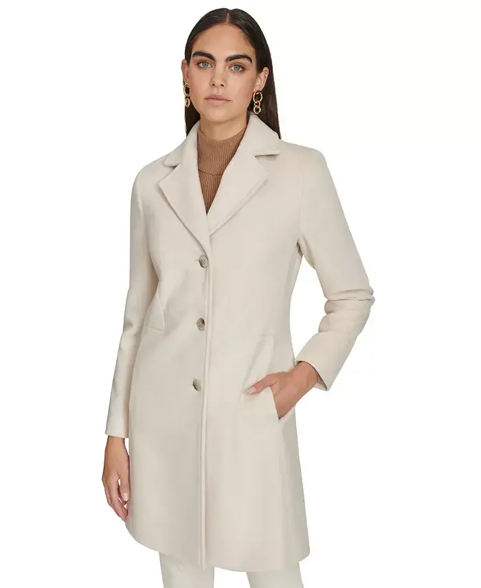 Calvin Klein's single-breasted coat is a classic pick designed with a notched collar and two convenient pockets. Approx. model height is 5'9" and she is wearing a size 4 Approx. 36" long from center back to hem Notched collar; front button closure Welt pockets at hips Lined Shell: 63% wool, 32% polyester, 5% casModazoneere; lining: 100% polyester Dry clean Imported