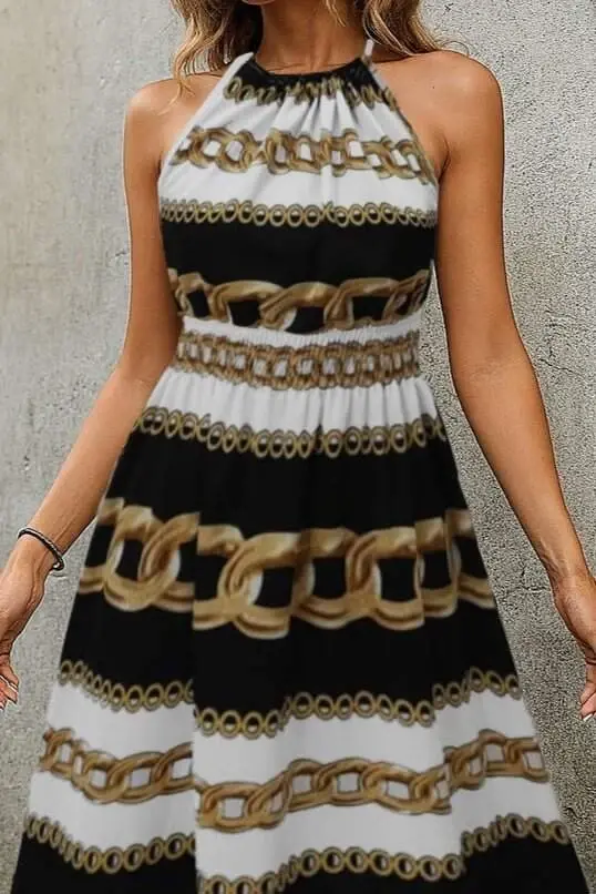 women's dress, sleeveless dress, halter dress, elastic waist dress, digital print dress, jersey dress, long dress, summer dress, comfortable dress, chic dress