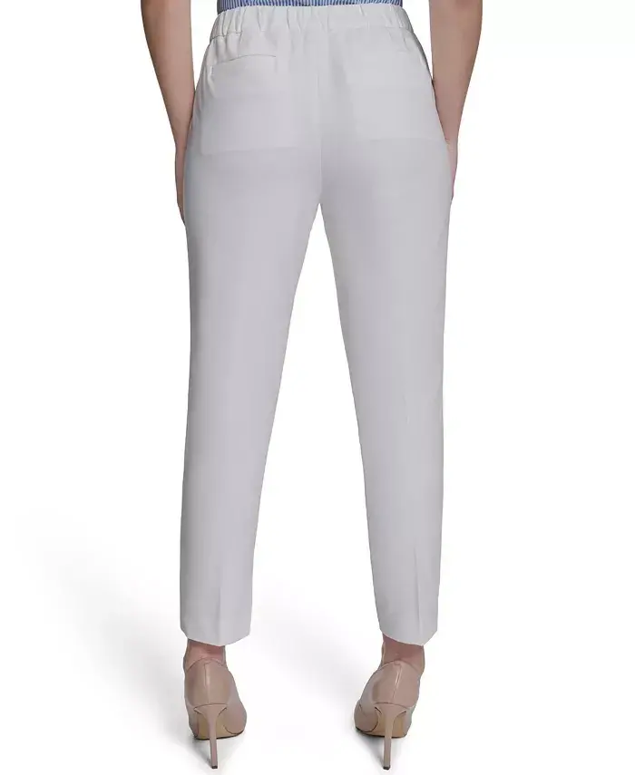 Tommy Hilfiger updates a versatile professional look with these slim-leg twill ankle pants finished with a comfortable elastic-back waistband. Approx. inseam: 28"; ankle length Mid-rise: approx. 10"; sits just below natural waist; slim leg Zipper with hook-and-bar closure at front Elastic back waistband Logo hardware at left front pocket Slant pockets at front; besom pockets at back 77% polyester, 18% rayon, 5% spandex; zipper: nylon Dry clean Imported
