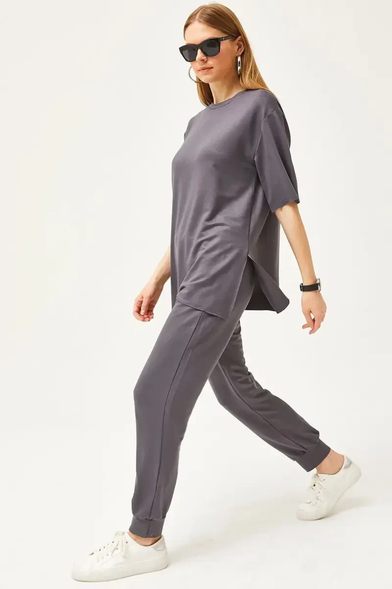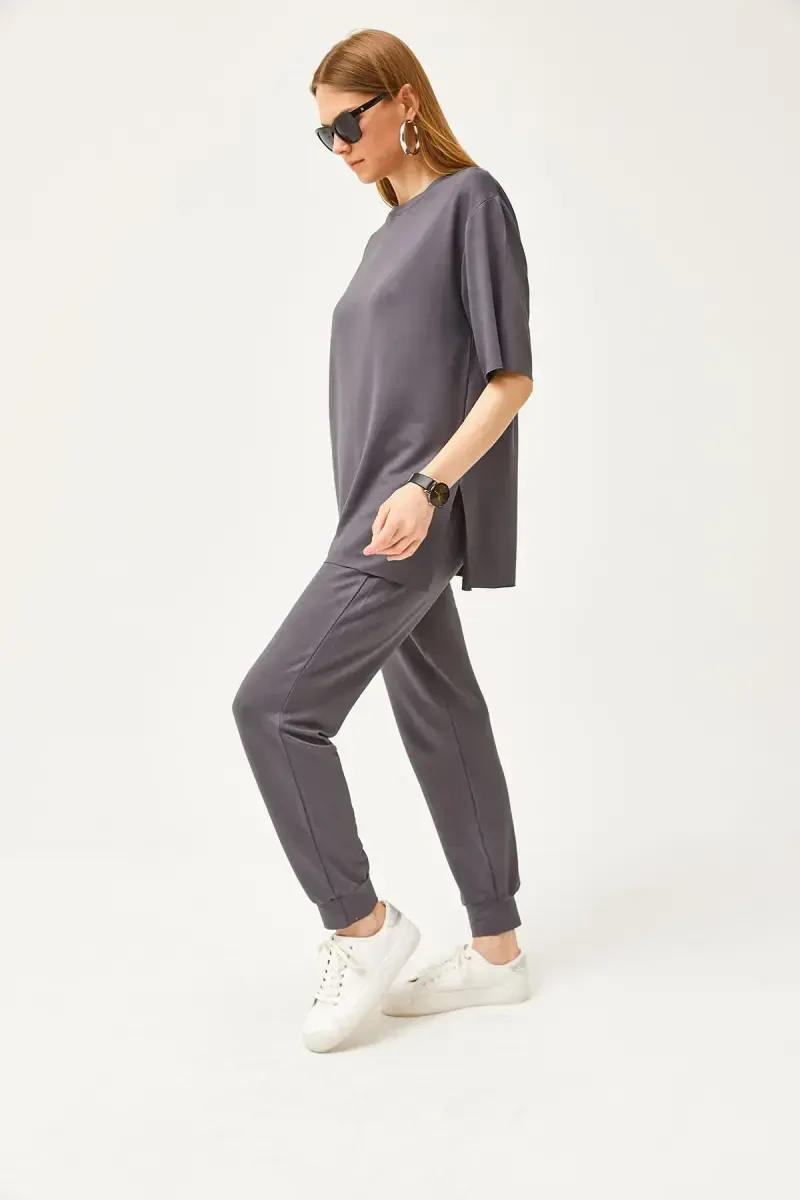 Experience elegance and comfort with the Women's Smokey Gray Draped Crystal Top and Bottom Set TKM-19000. Its special design, appealing to all age groups, will make it an indispensable part of your wardrobe. This set is offered with the assurance of Olalook Official. While creating a modern silhouette with its straight leg cut, it offers timeless elegance thanks to its plain design. The cotton and polyester blend fabric provides a comfortable wearing experience throughout the day. The regular fit gently sits on your body without restricting your freedom of movement. The woven fabric type increases the durability of the product, offering long-lasting use. The crew neck detail combines both comfort and elegance. The long length design makes your legs look longer and provides an elegant appearance. The regular waist cut prioritizes your comfort by offering a comfortable fit all day long. The smokey gray color helps you easily complete your style by harmonizing with all kinds of combinations. Crystal details add an elegant touch to the set, while the draped cut supports your freedom of movement. This set is an ideal option for both daily use and your special occasions. You can easily combine it with other pieces in your wardrobe and create different styles. It can be easily cleaned according to the Type 1 washing instructions, thus extending the life of the product. While creating a timeless elegance thanks to its plain pattern, the standard sleeve type is ideal for daily use. Enjoy being both stylish and comfortable with the Women's Smokey Gray Draped Crystal Top and Bottom Set TKM-19000.